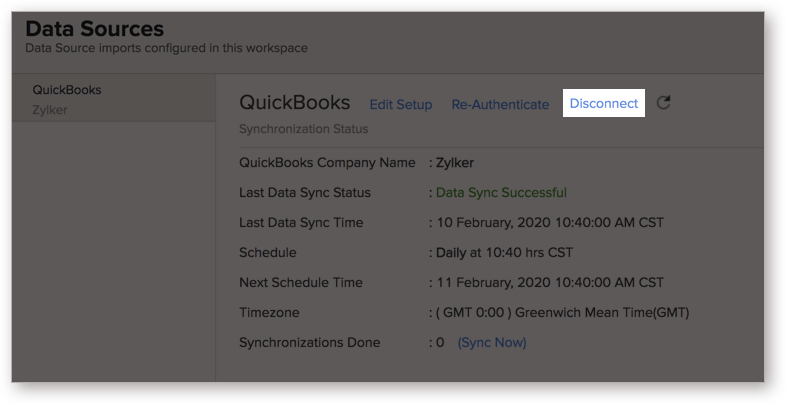 You can disconnect your QuickBooks connection from within Zoho Analytics as well as QuickBooks Online.