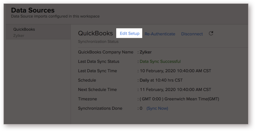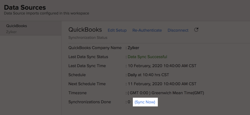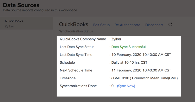 You can view detailed information about the data synchronization that happens between QuickBooks and Zoho Analytics by following the steps given below.