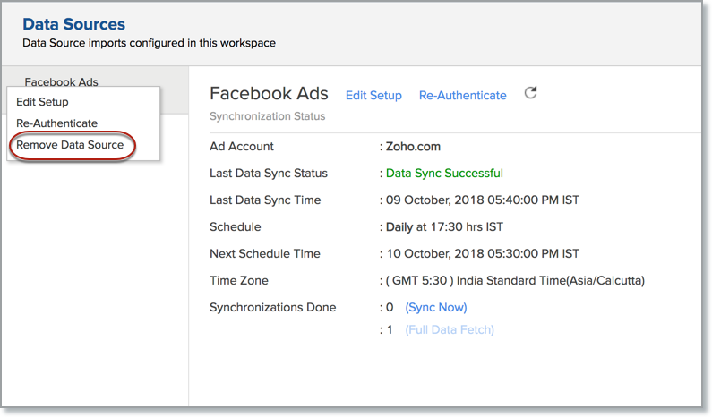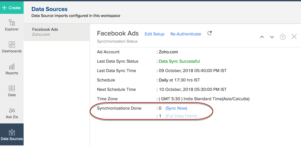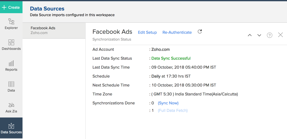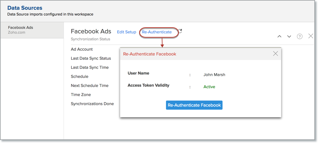 12. How do I Re-authenticate my Facebook Ads account in Zoho Analytics?