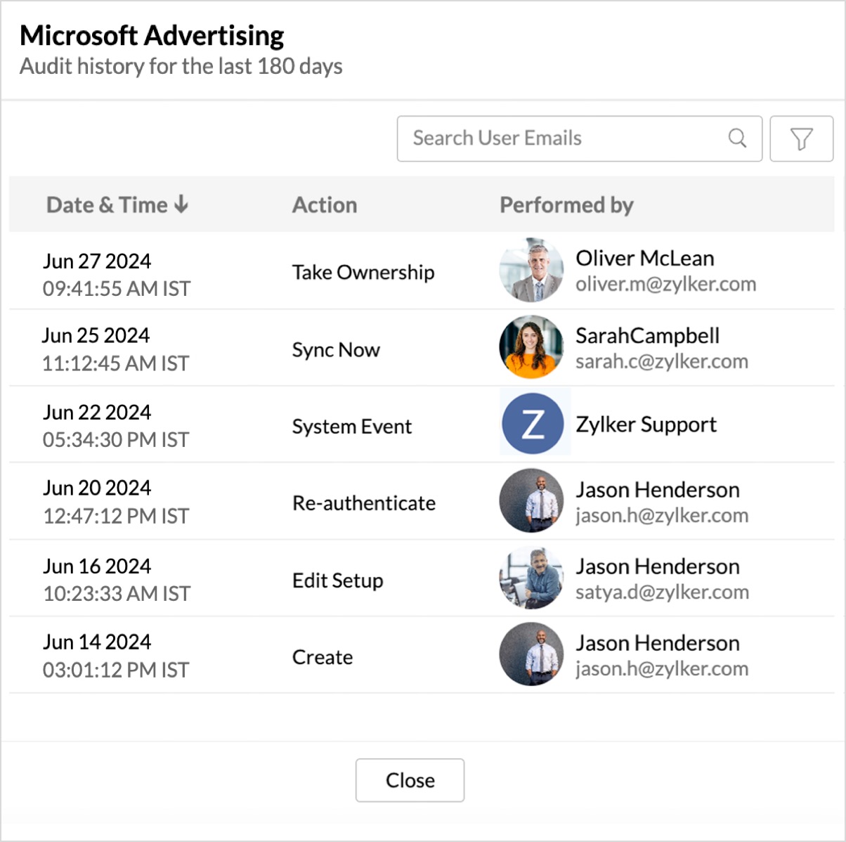Zoho Analytics logs all the user activities and system events within the Microsoft Advertising workspace. The following actions that are logged in Zoho Analytics,