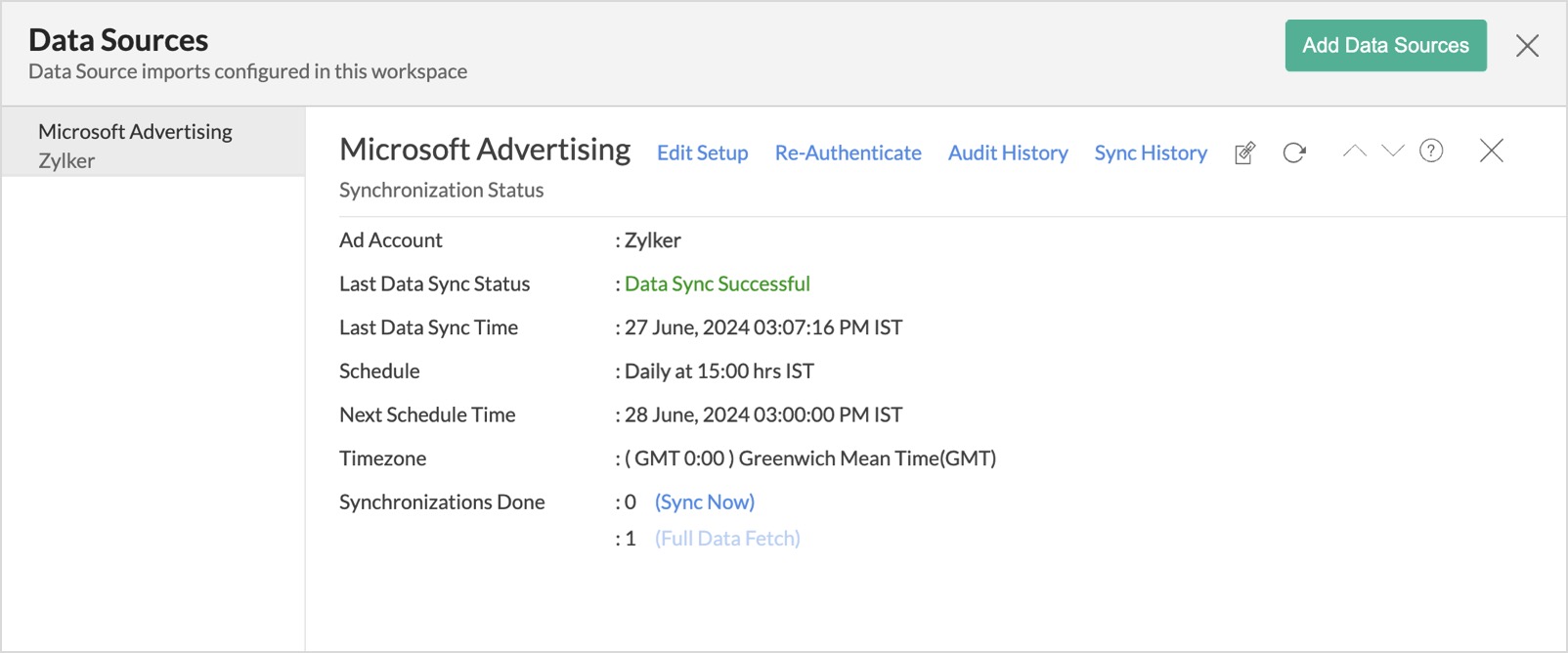 The Data Sources tab provides essential information to monitor and manage the integration setup. It also allows you to edit the settings as needed. Users with administrator privileges will be able to view and modify the connection settings.