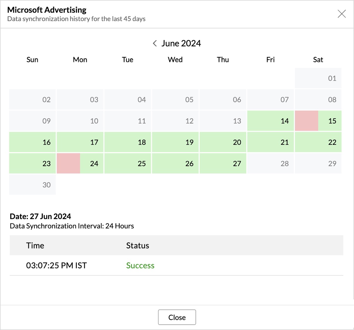 The Sync History tab provides details about the data sync for the last 45 days. A successful data sync is marked in green, and a sync failure is marked in red.