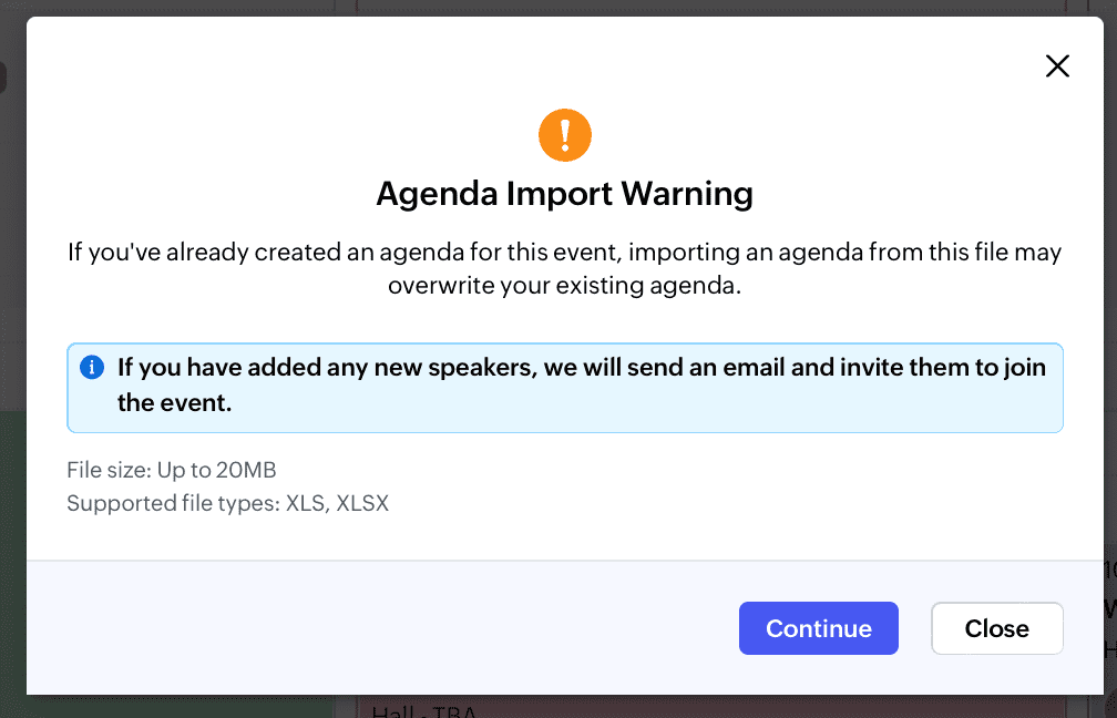 Use the Export option to download a reference spreadsheet. Ensure that you add a sample session in the agenda before exporting so that you can understand the format in which you must add your session data.