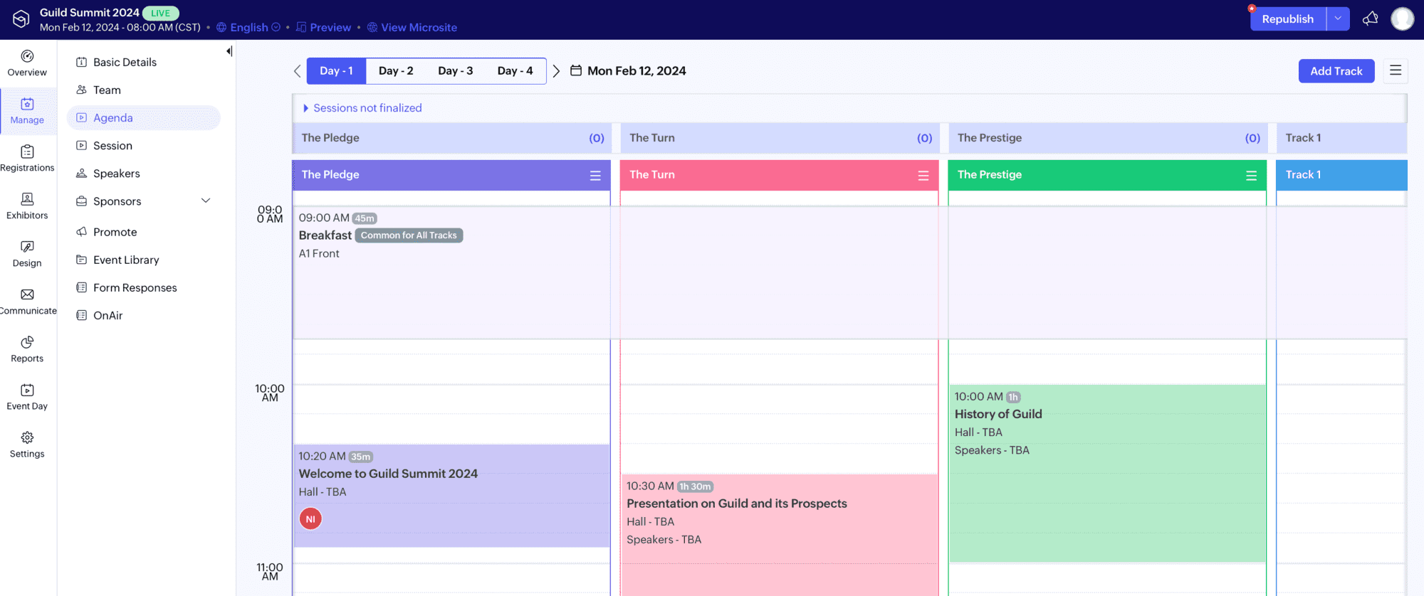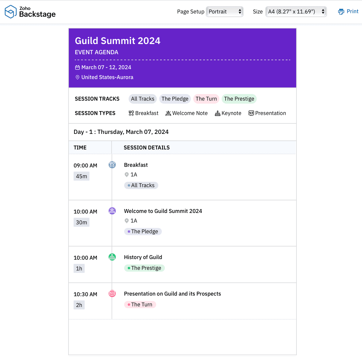 Select the Print/Download Agenda option. You will be redirected to a new page with a preview of all the days in the event agenda.