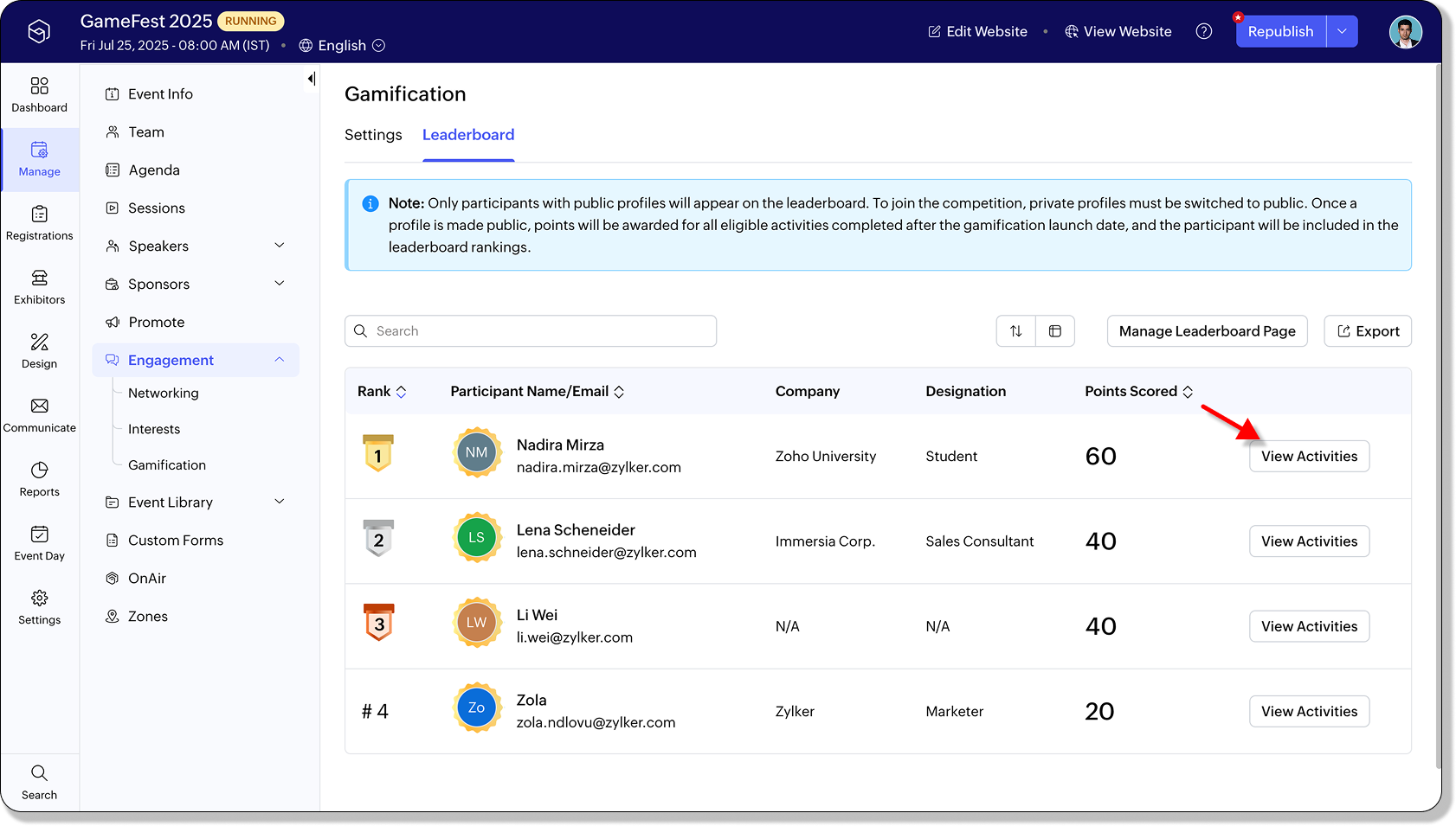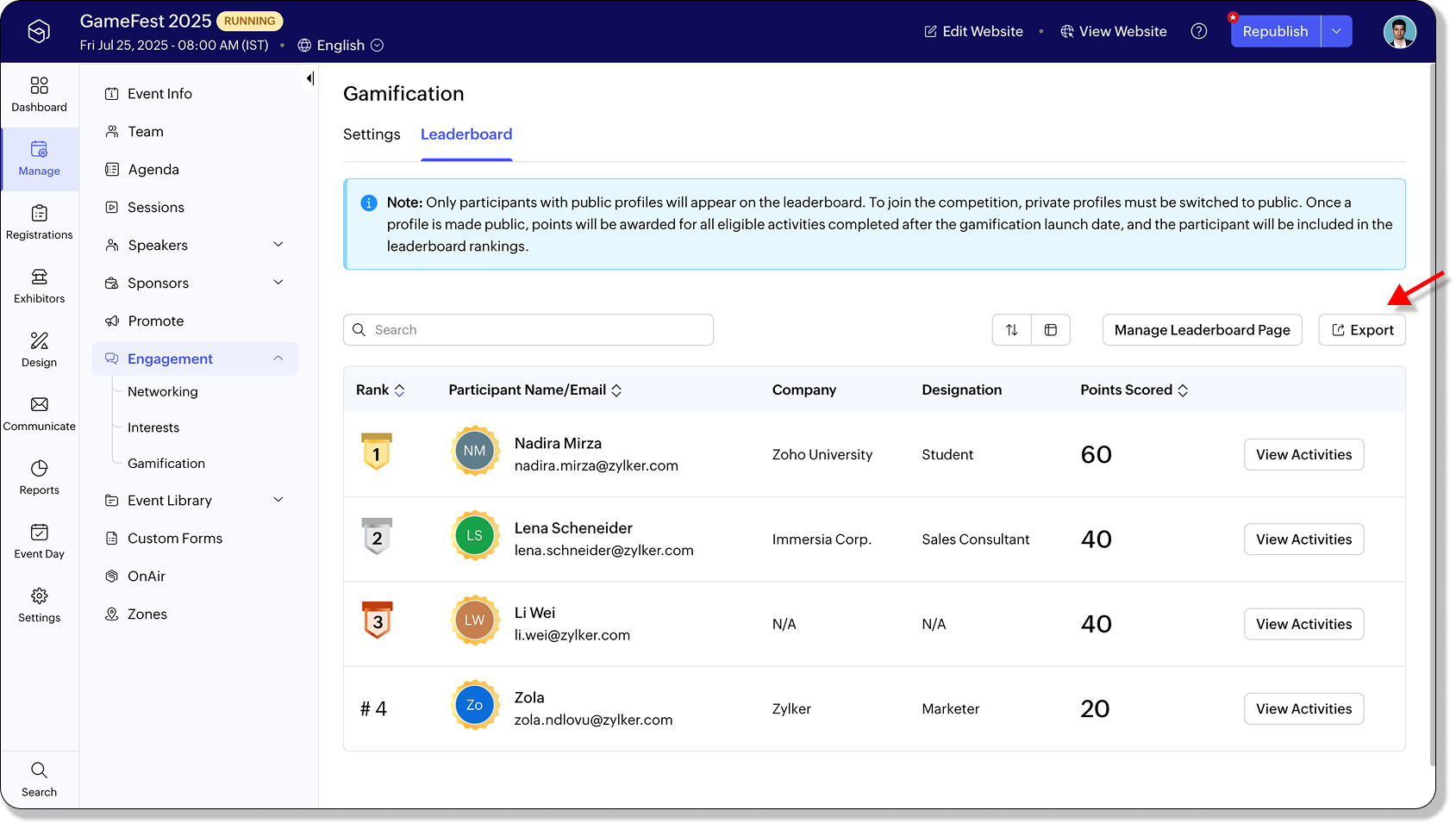 Publishing the leaderboard extends visibility beyond the admin view. It allows you to showcase top performers at the venue, on your website, or in post-event communications.