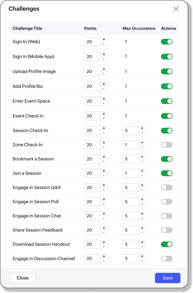 Example: “Session Check-In” might offer 20 points and allow a maximum of 5 check-ins.