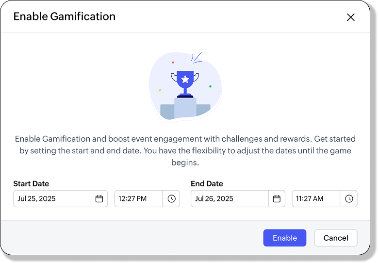 Before participants start earning points, gamification must be activated with a defined time frame. This ensures fairness by counting only those interactions that happen during the active period. Activating gamification also unlocks access to configuration panels for challenges, rewards, and leaderboard customization. To get started: