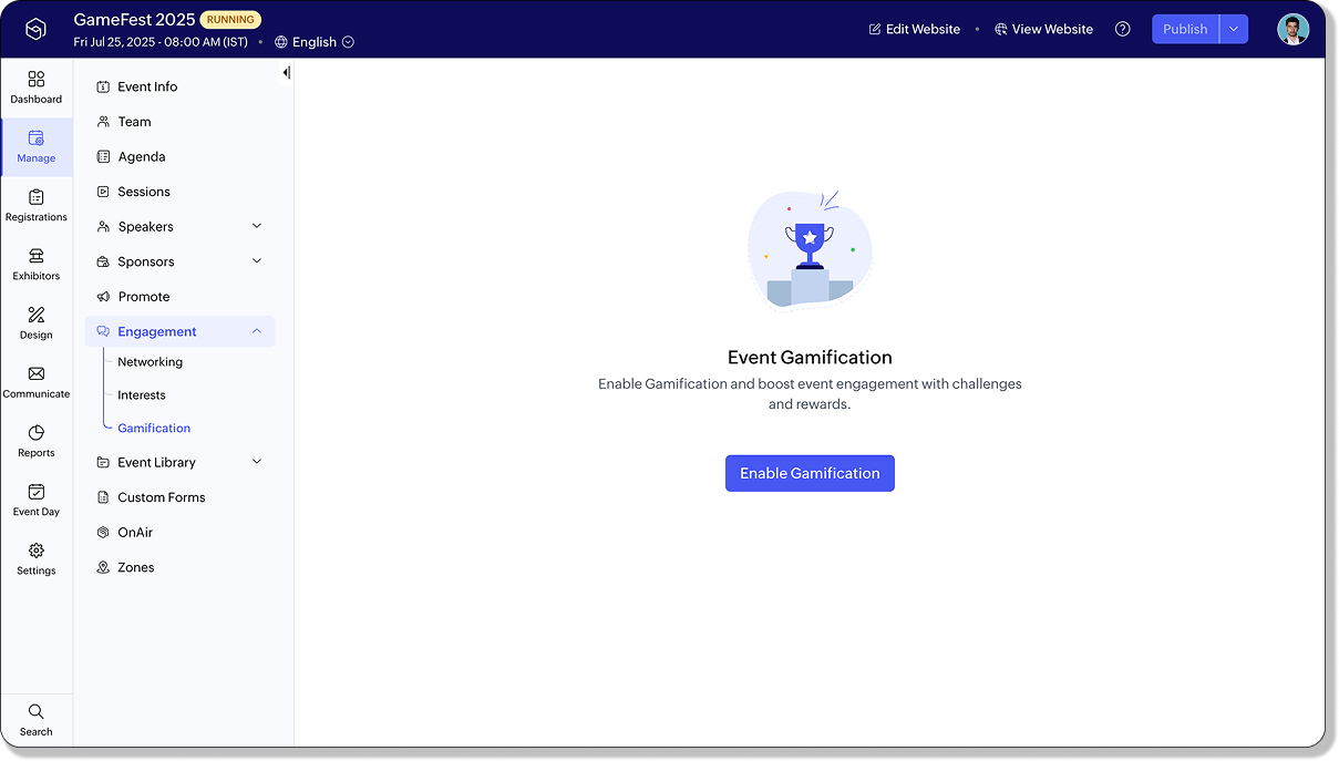 Gamification adds a playful, competitive layer to your event by recognizing and rewarding participant engagement. It’s designed to encourage participation in sessions, networking, and exhibitor interactions, helping you drive traffic where it matters most. Whether you’re running an in-person, virtual, or hybrid event, gamification builds momentum and boosts visibility for key event activities.
