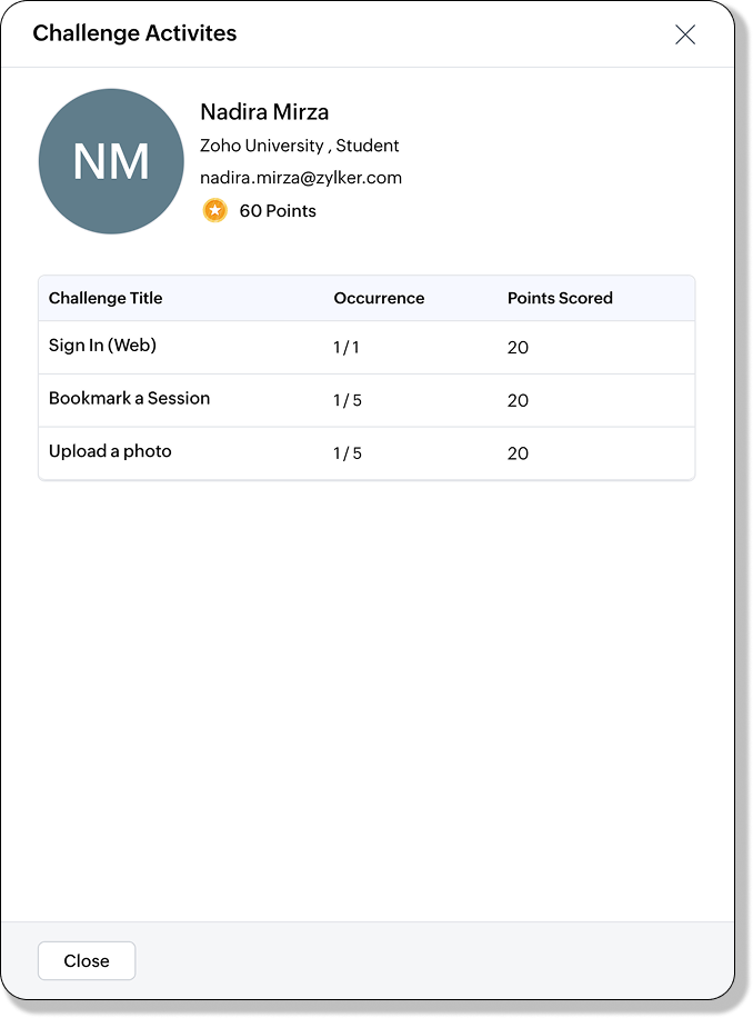 Zoho Backstage supports a limited set of custom gamification tasks to help you align with your event’s engagement goals. If you’d like to explore a challenge outside the predefined list, please contact our support team at