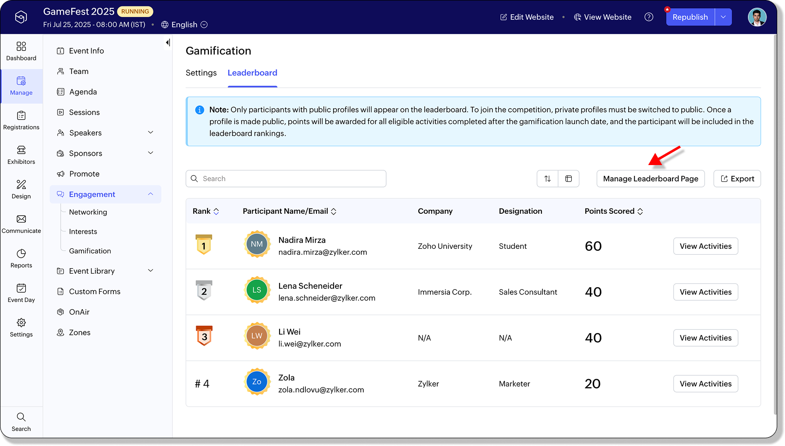 - Navigate to the Manage > Engagement > Gamification > Leaderboard tab from the Dock.