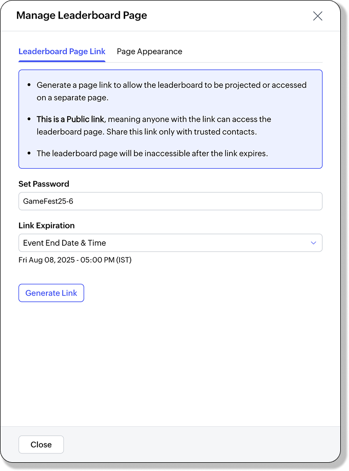 - Once generated, the link and password must be shared together. Users must enter the correct password to access the leaderboard page.