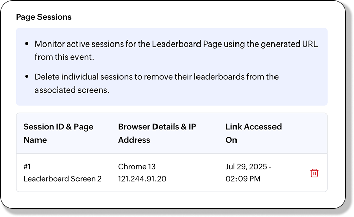 - The Page Sessions section lists all active sessions where the leaderboard link has been accessed.