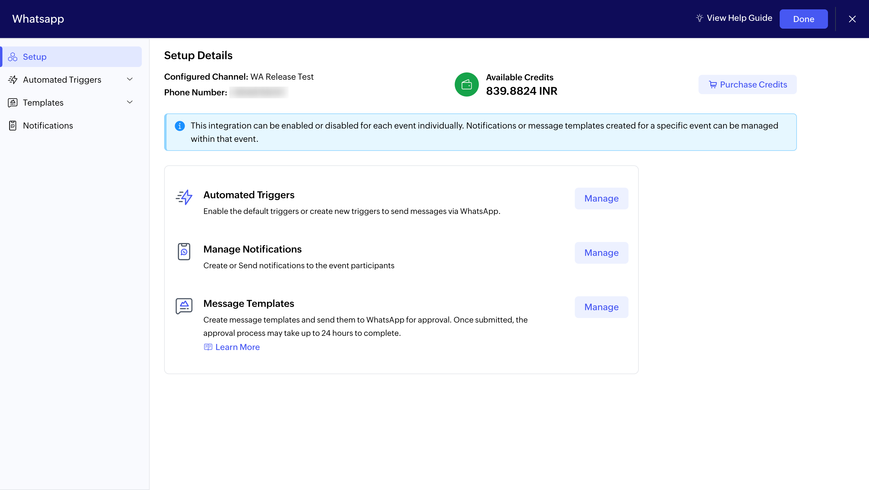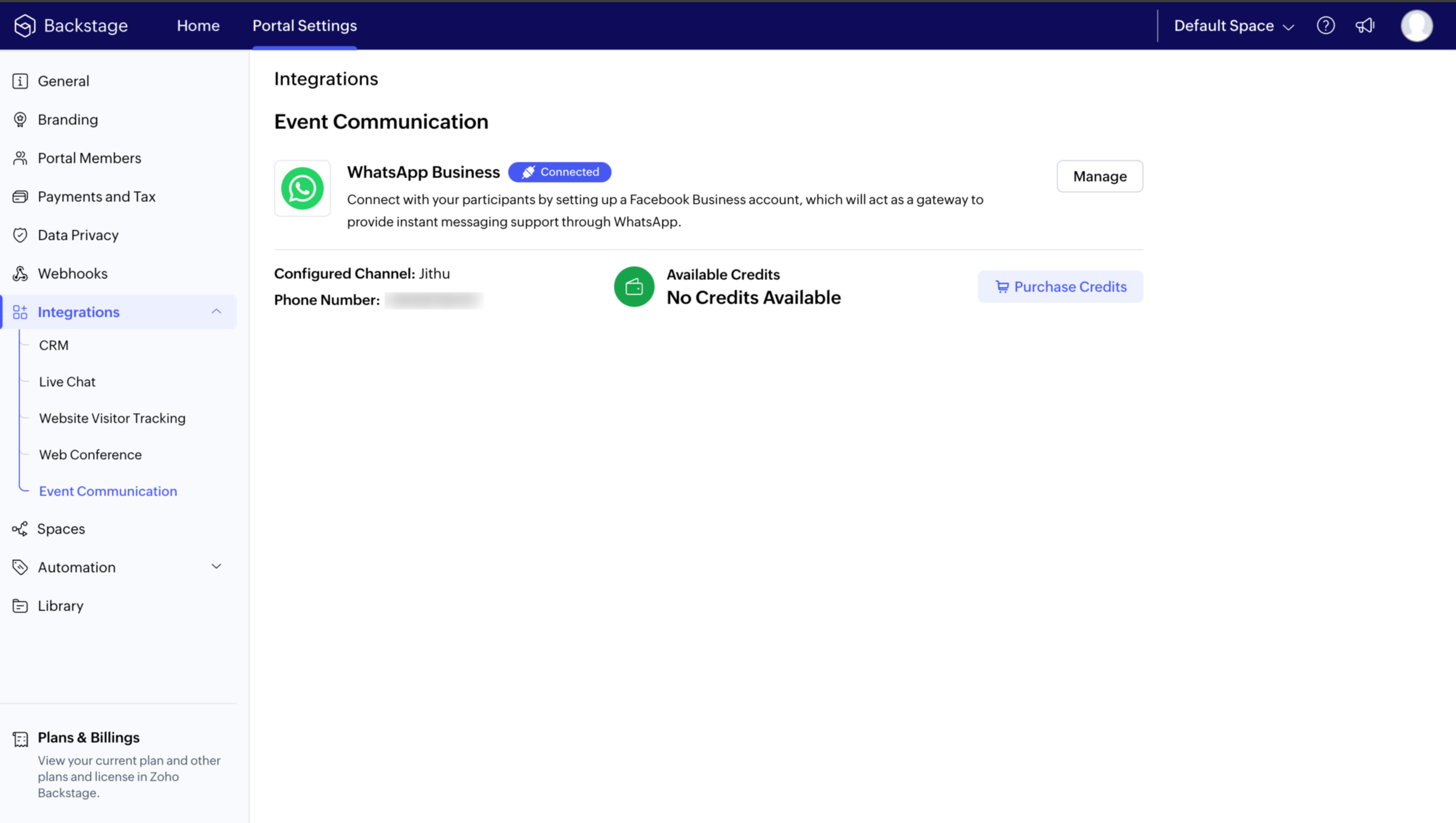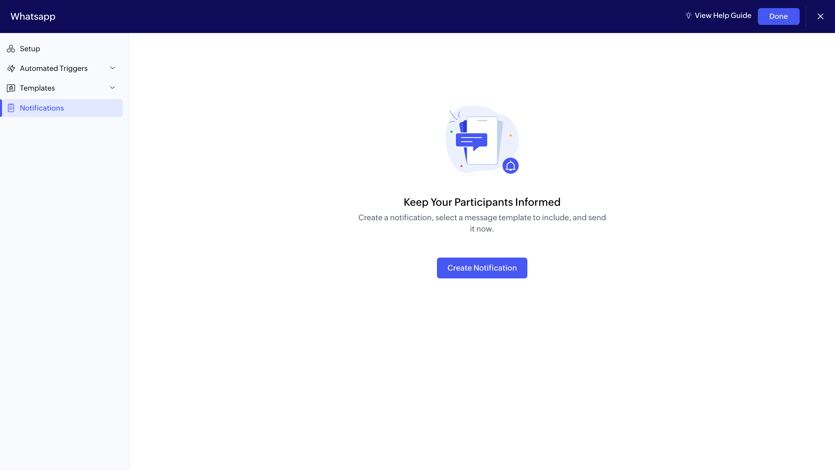 WhatsApp Integration in Zoho Backstage enables event organizers to communicate directly with attendees through one of the world’s most widely-used messaging platforms. By connecting WhatsApp to Zoho Backstage, organizers can send important event updates, reminders, and announcements directly to participants' WhatsApp accounts. This integration allows for a seamless and efficient way to keep participants informed and engaged before, during, and after the event.