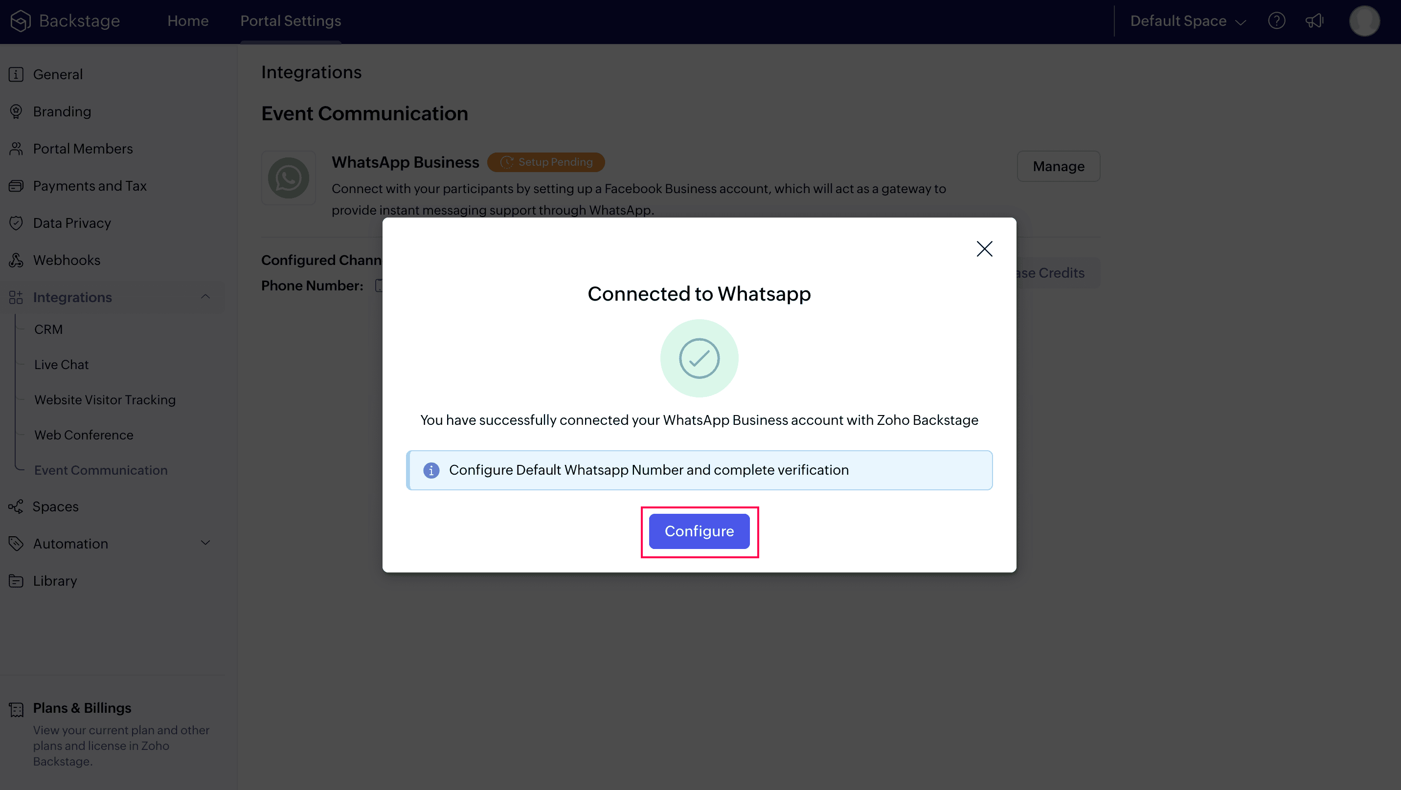 Back in Zoho Backstage, click Configure on the Connected to WhatsApp dialog box.