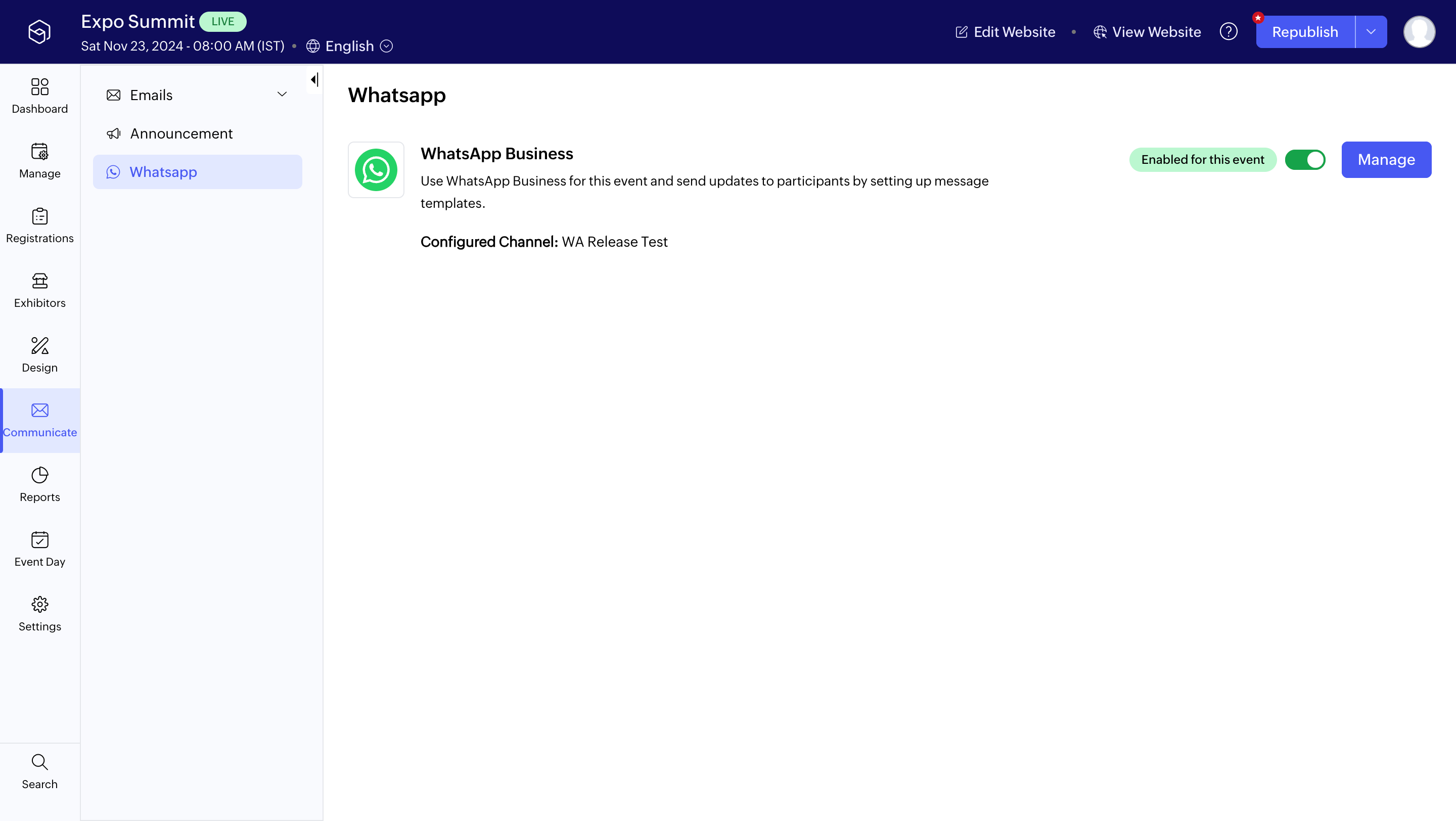 Click the WhatsApp Business toggle button to enable WhatsApp for that particular event.