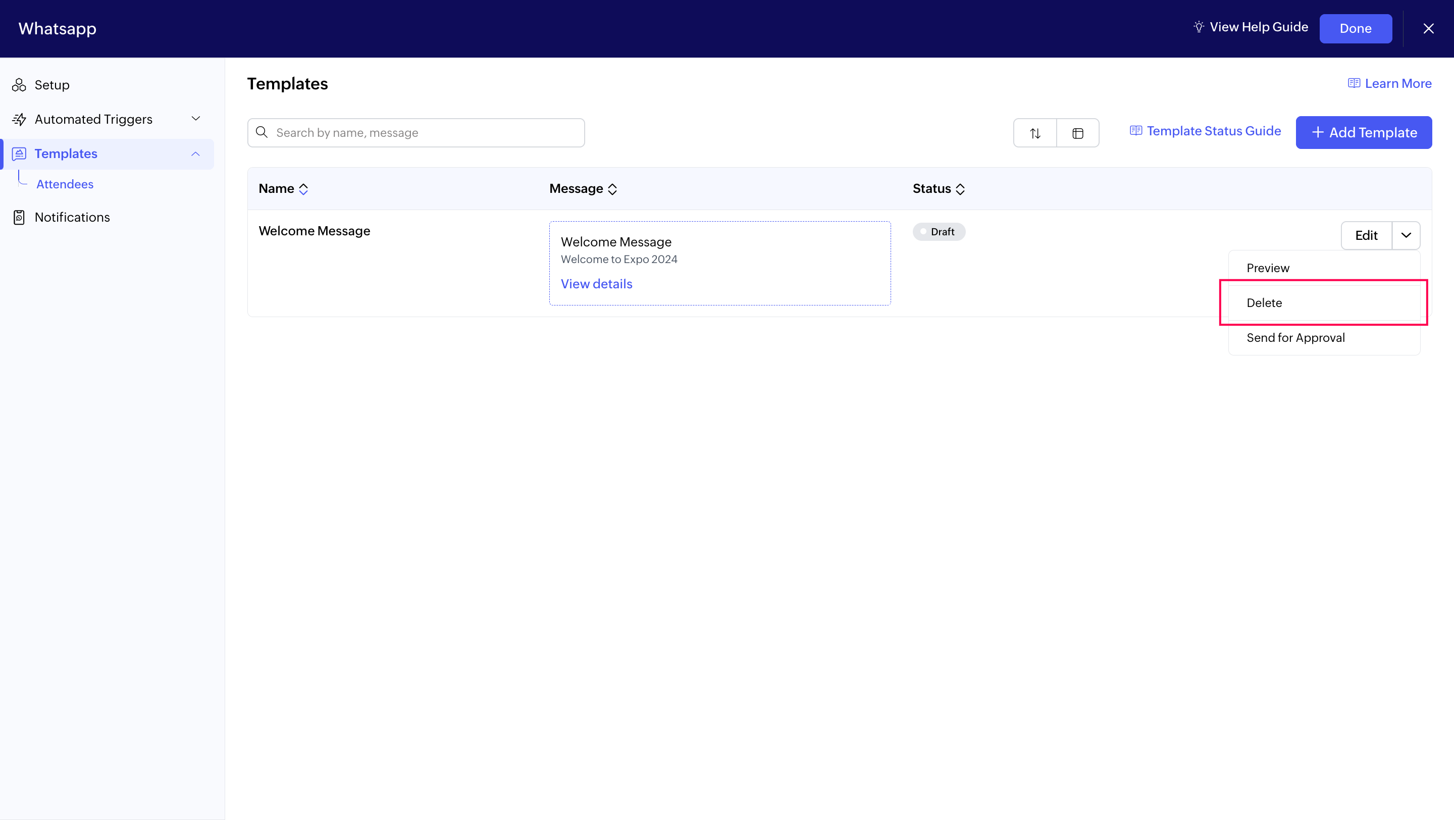 In the Templates page, open the dropdown associated with a template and click Send for Approval to send the template to WhatsApp for approval.