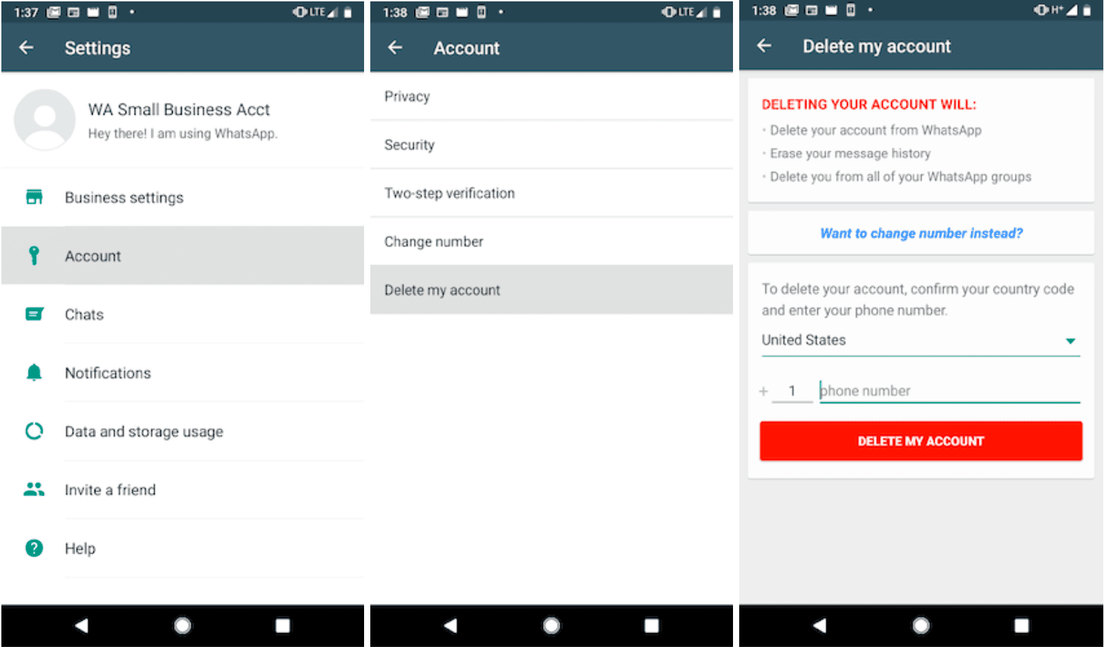 Open WhatsApp Messenger or WhatsApp Business app on your device, go to Settings > Account > Delete my account.