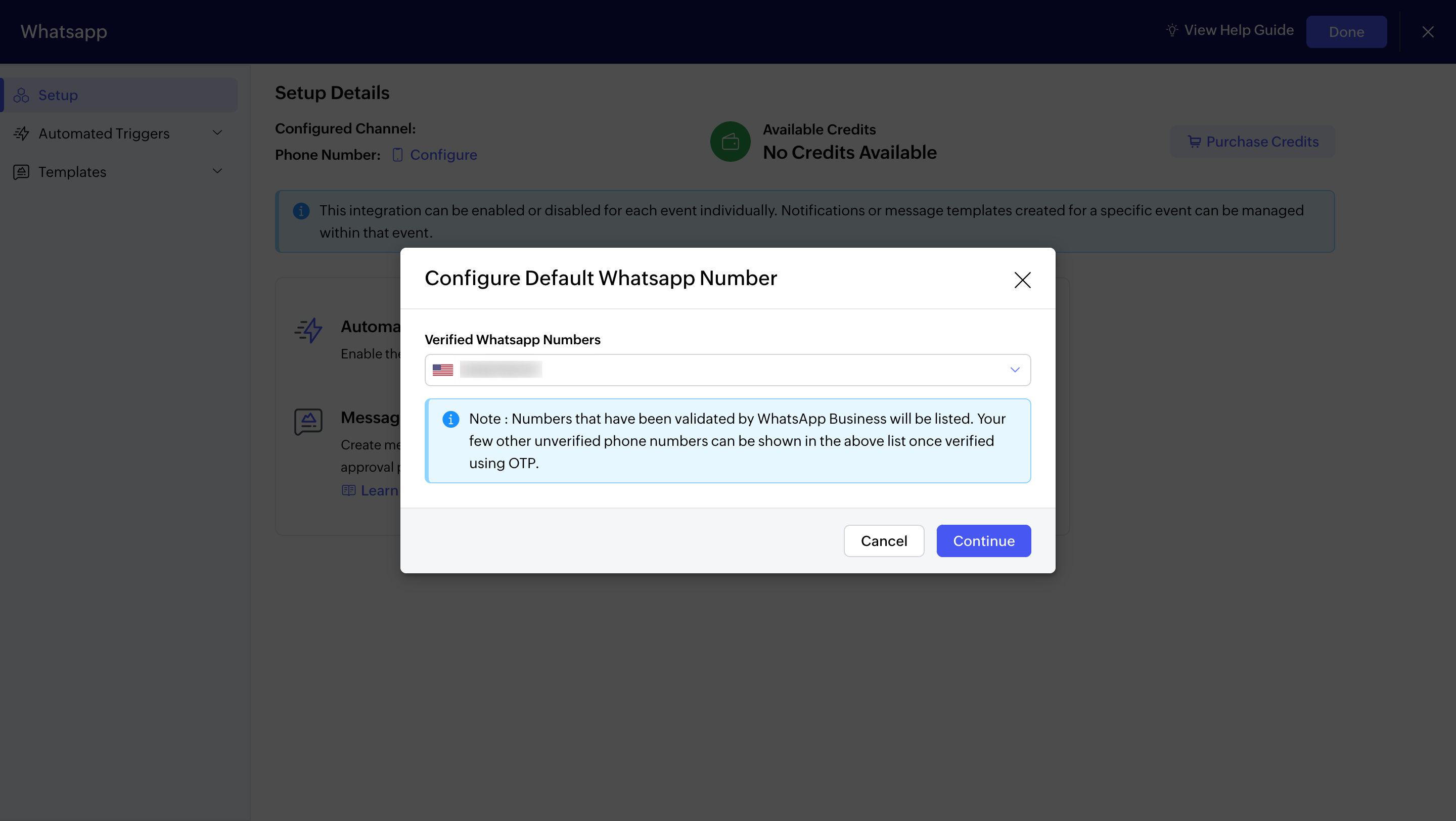 In the Configure Default WhatsApp Number dialog box, choose a number from the Verified WhatsApp Numbers dropdown.