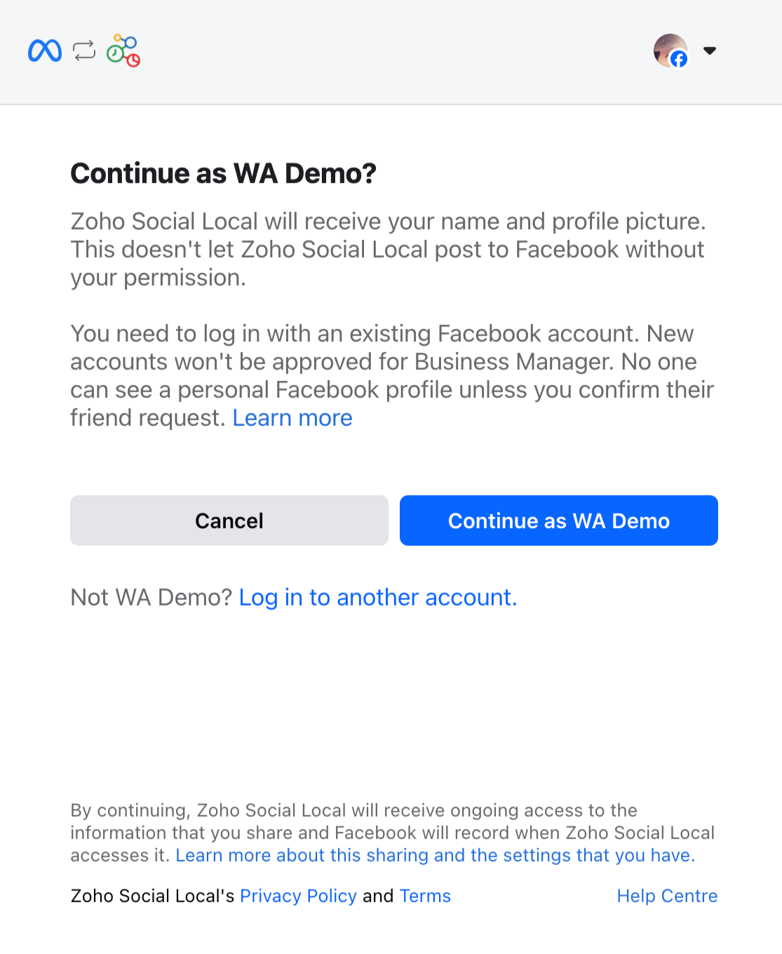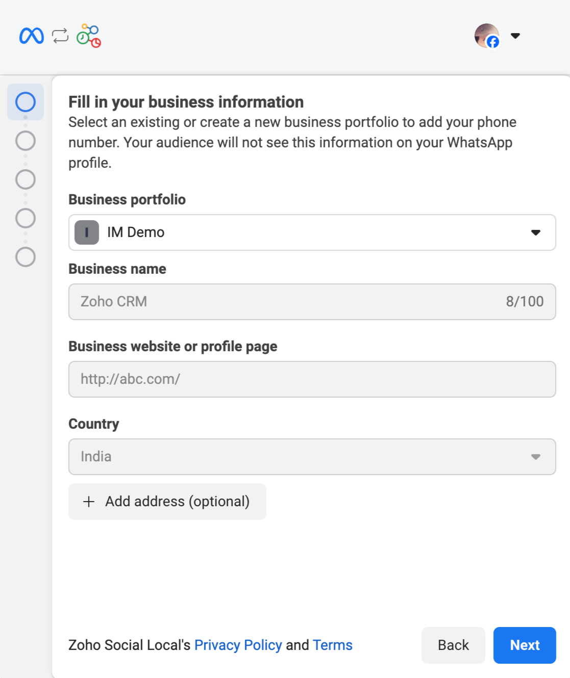 Complete the Embedded Signup with the same Meta Business Manager where the phone number resides to create a new WABA in Zoho.