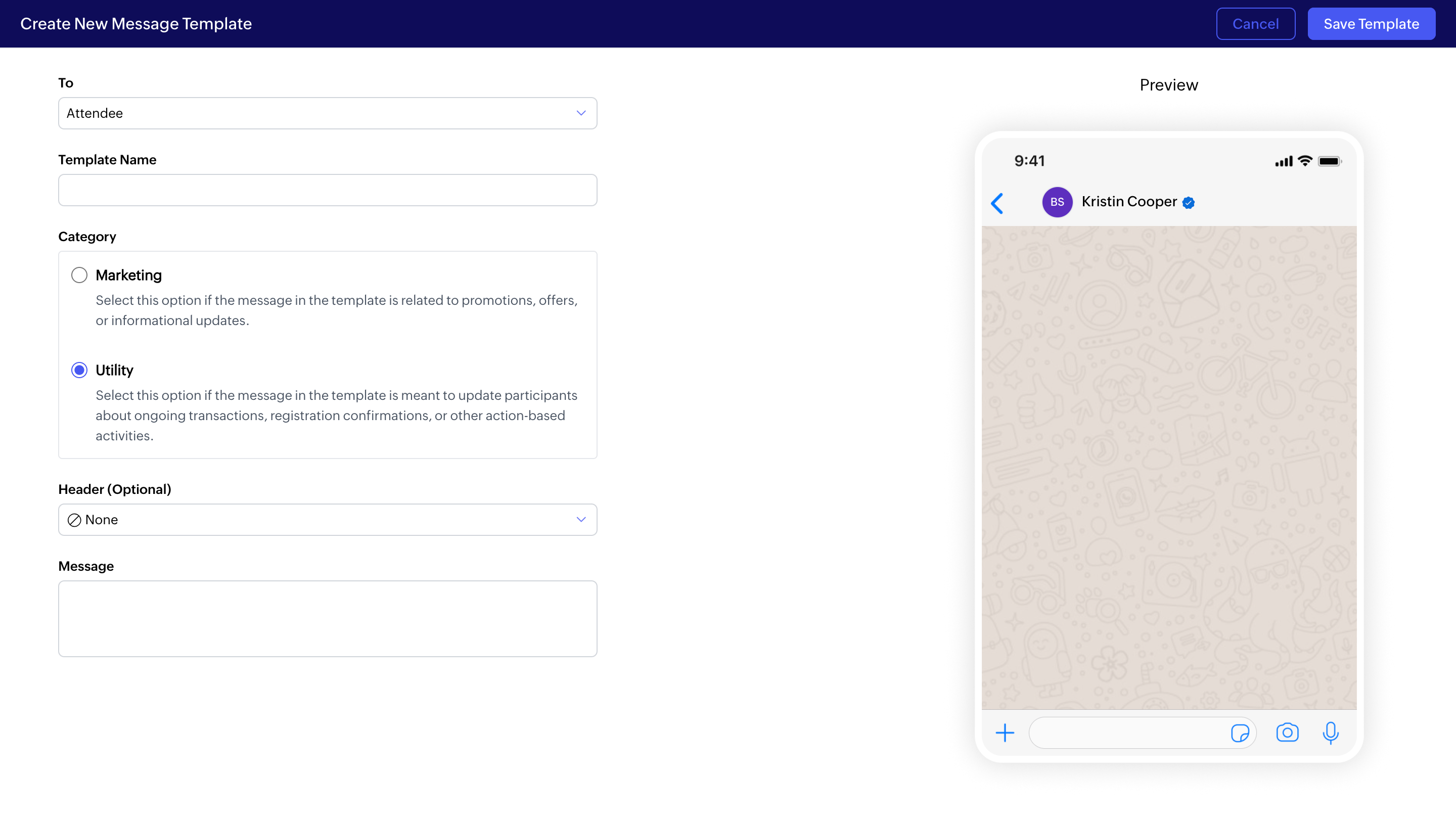 The Template Category could either be Utility or Marketing. Learn more about Template Categorization.