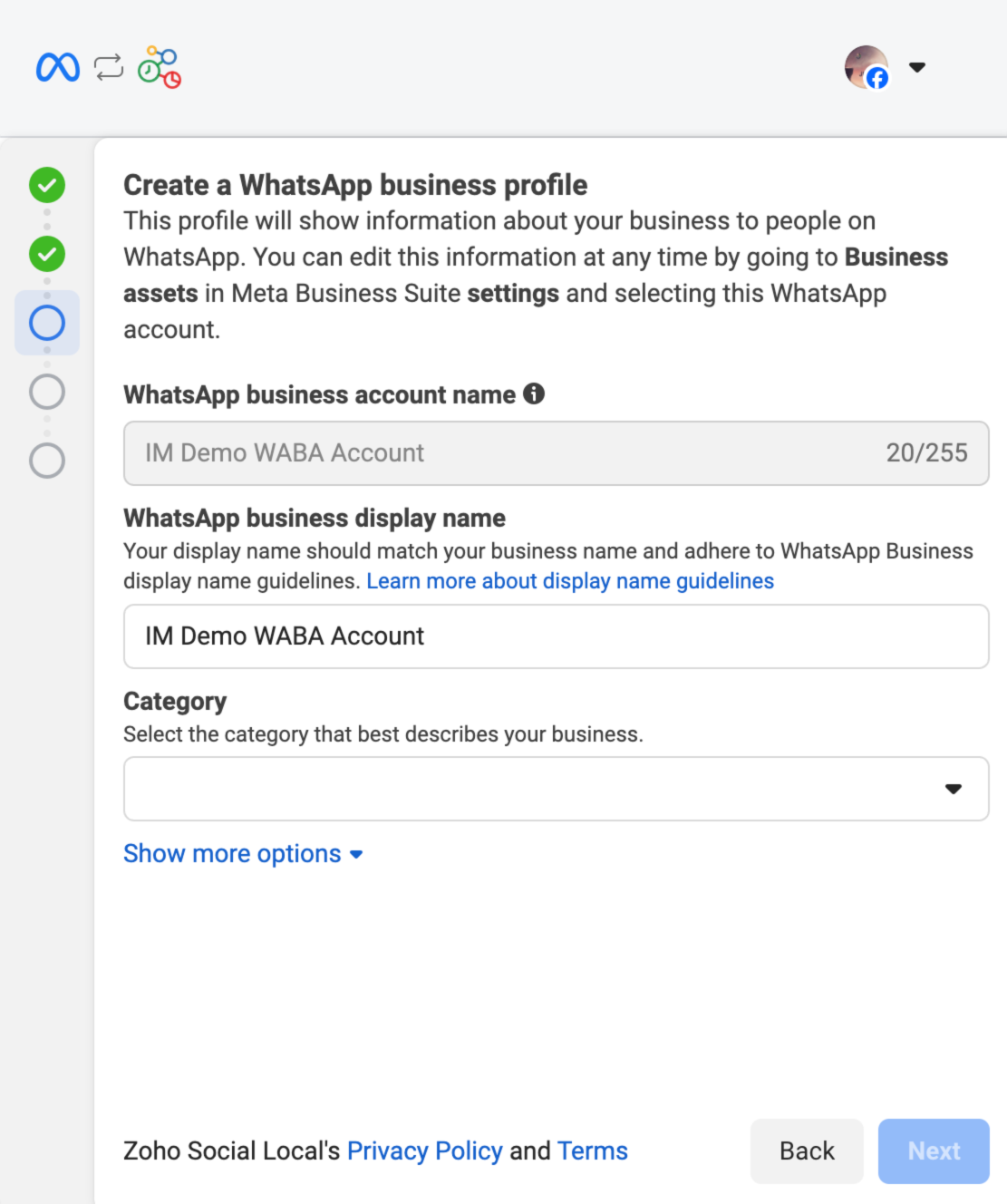 On the Create a WhatsApp business profile page, enter the name in the WhatsApp business account name field if you don’t have one already.