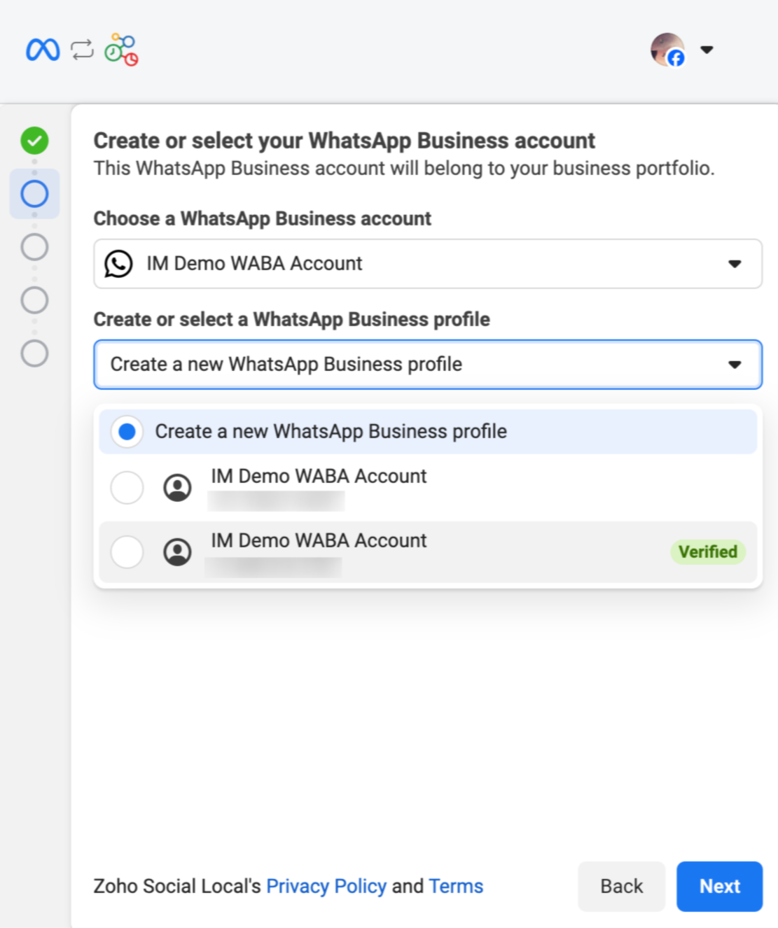 In the Choose a WhatsApp Business account dropdown, choose from the existing WhatsApp Business accounts in the dropdown.
