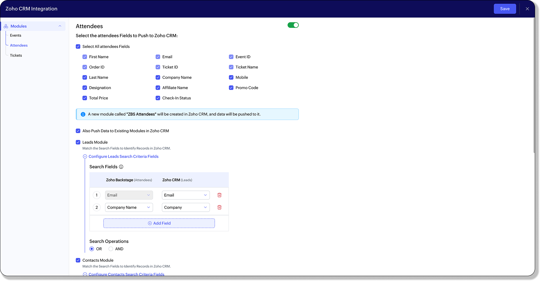 - A new module called ZBS Attendees will be created in Zoho CRM. The selected data will be pushed to this module automatically.