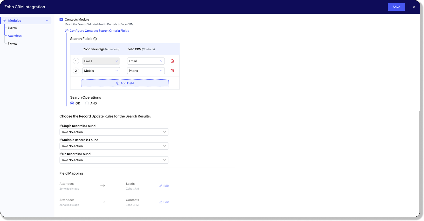 - For each search field, choose a value from the Zoho Backstage (Attendees) dropdown, then select the corresponding field from Zoho CRM.