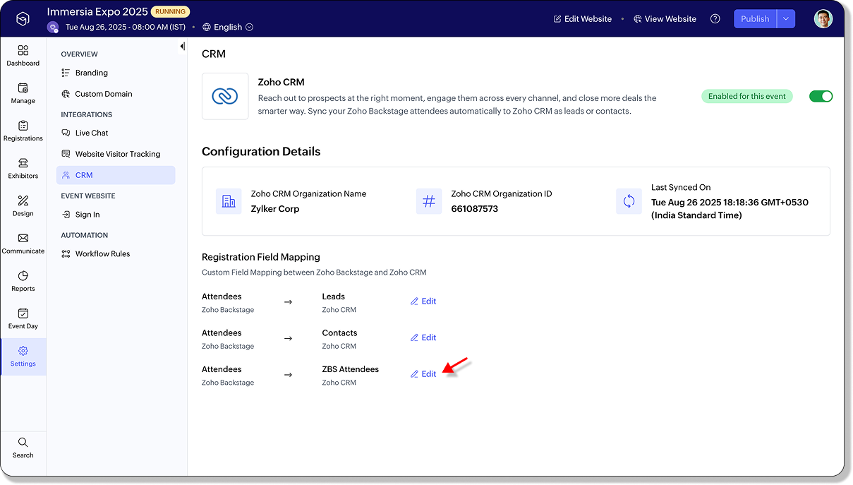 - In the Edit panel, map the Zoho Backstage fields to the appropriate Zoho CRM fields.