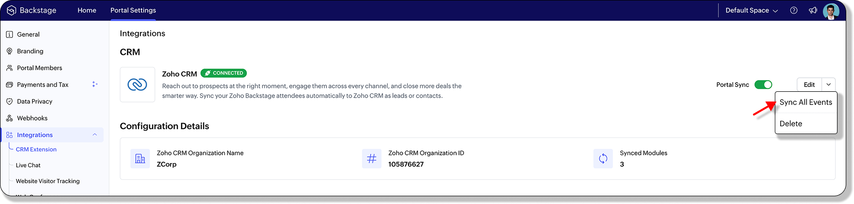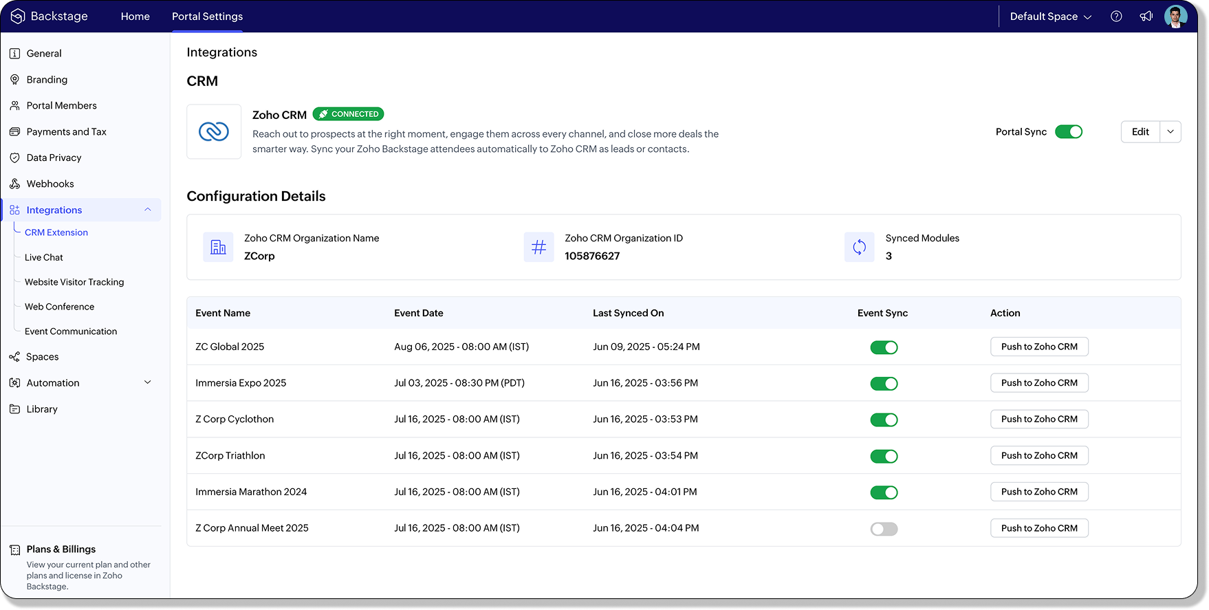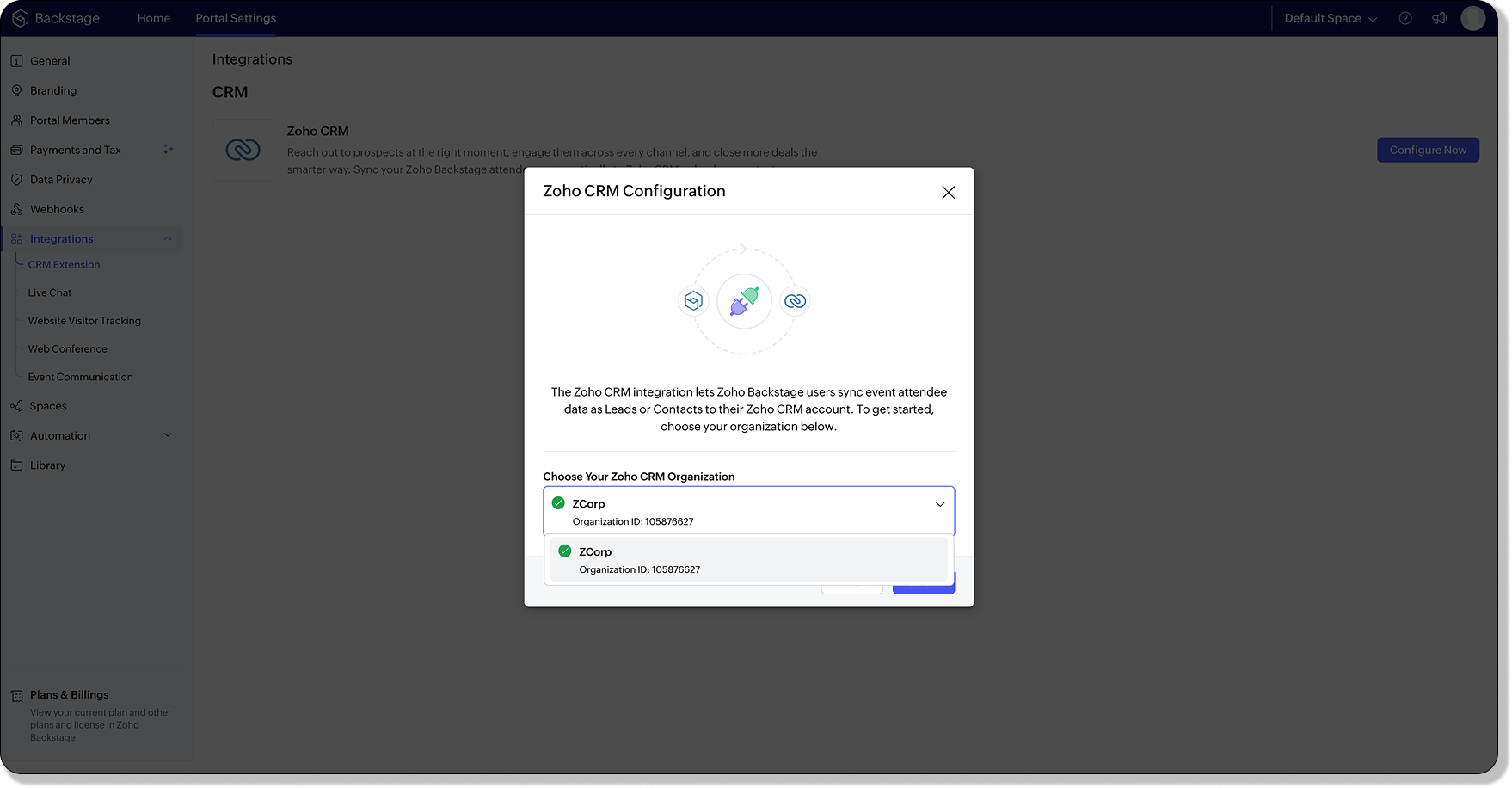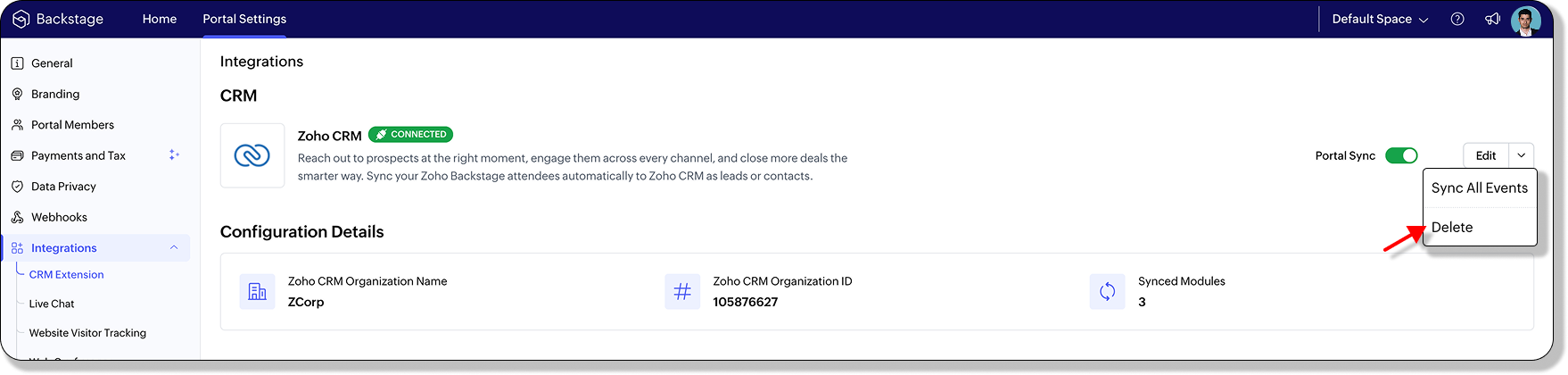 - This action will permanently remove the integration between Zoho Backstage and Zoho CRM.