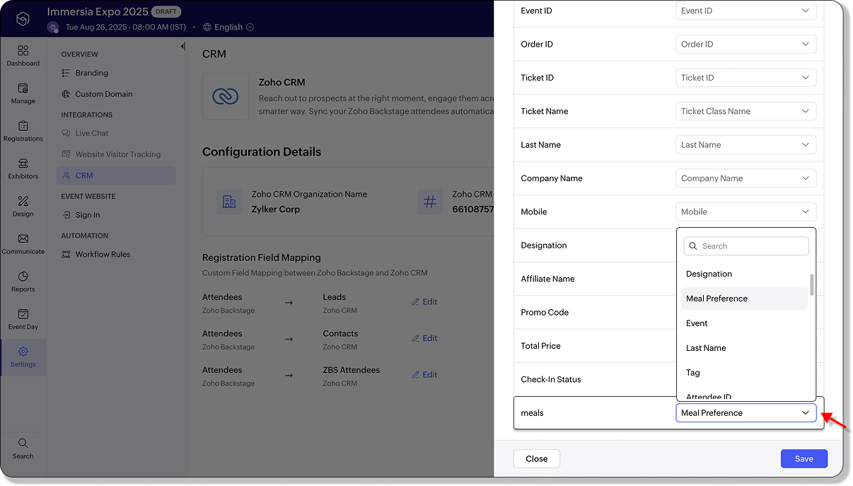 For smooth syncing, create the relevant custom fields in Zoho CRM before mapping. For example, if your registration form collects details like meal preferences or T-shirt sizes, make sure those fields exist in CRM so the data maps correctly.