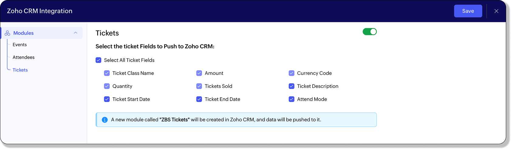 - Use the checkboxes to select the attendee fields you want to push to Zoho CRM. To select all available fields at once, use the Select All Ticket Fields option. The available options include: