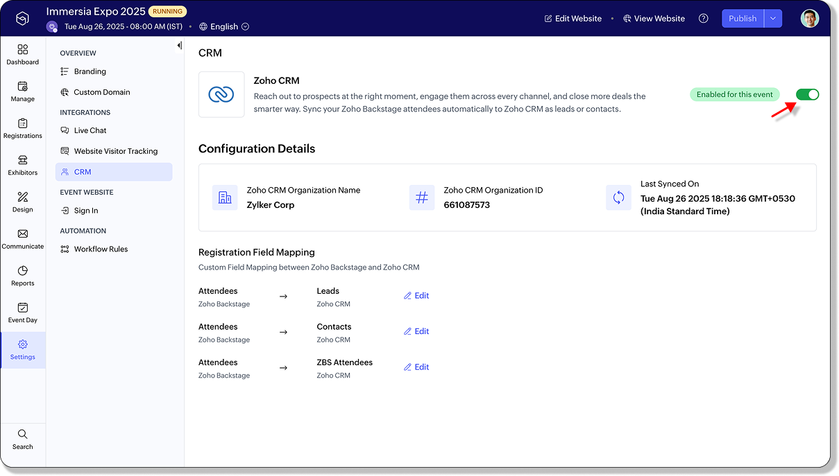 If you no longer want attendee data from a particular event to sync with Zoho CRM, you can disable the integration.