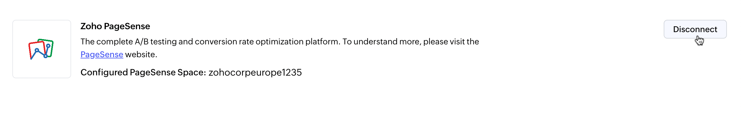 3. Click the menu button near the Zoho PageSense section and click the Disconnect option. The Disconnect PageSense integration dialog box will appear.