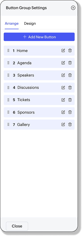 1. Hover over the Menu section in the Footer section and click the edit icon which appears whole hovering over a button. Alternatively click the edit icon adjacent to a button in th arrange tab of Button Group Settings panel