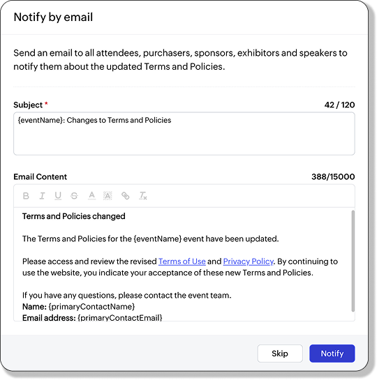 2. If you update either the Terms or the Privacy Policy for the event, participants will receive an email notification about the change. After saving your updates, the email content will appear on the screen for your review and can be edited before sending.