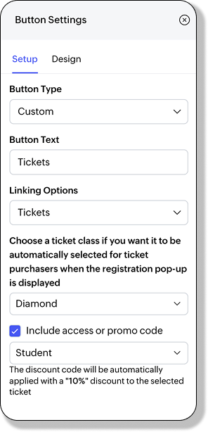 • Tickets: Select a ticket class and optionally include an access or promo code.