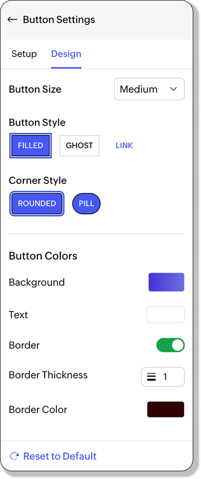 2. In the Setup tab, choose a Button Type from the dropdown. Based on the selected type, the following button types and options will appear: