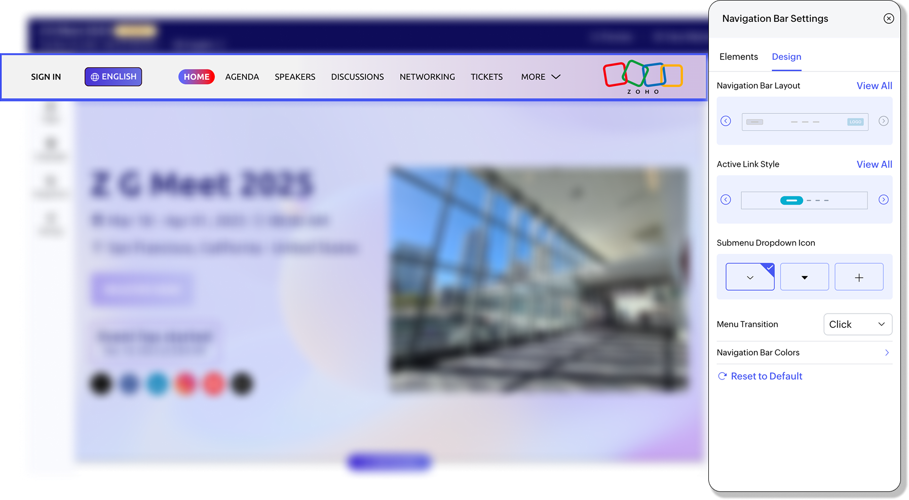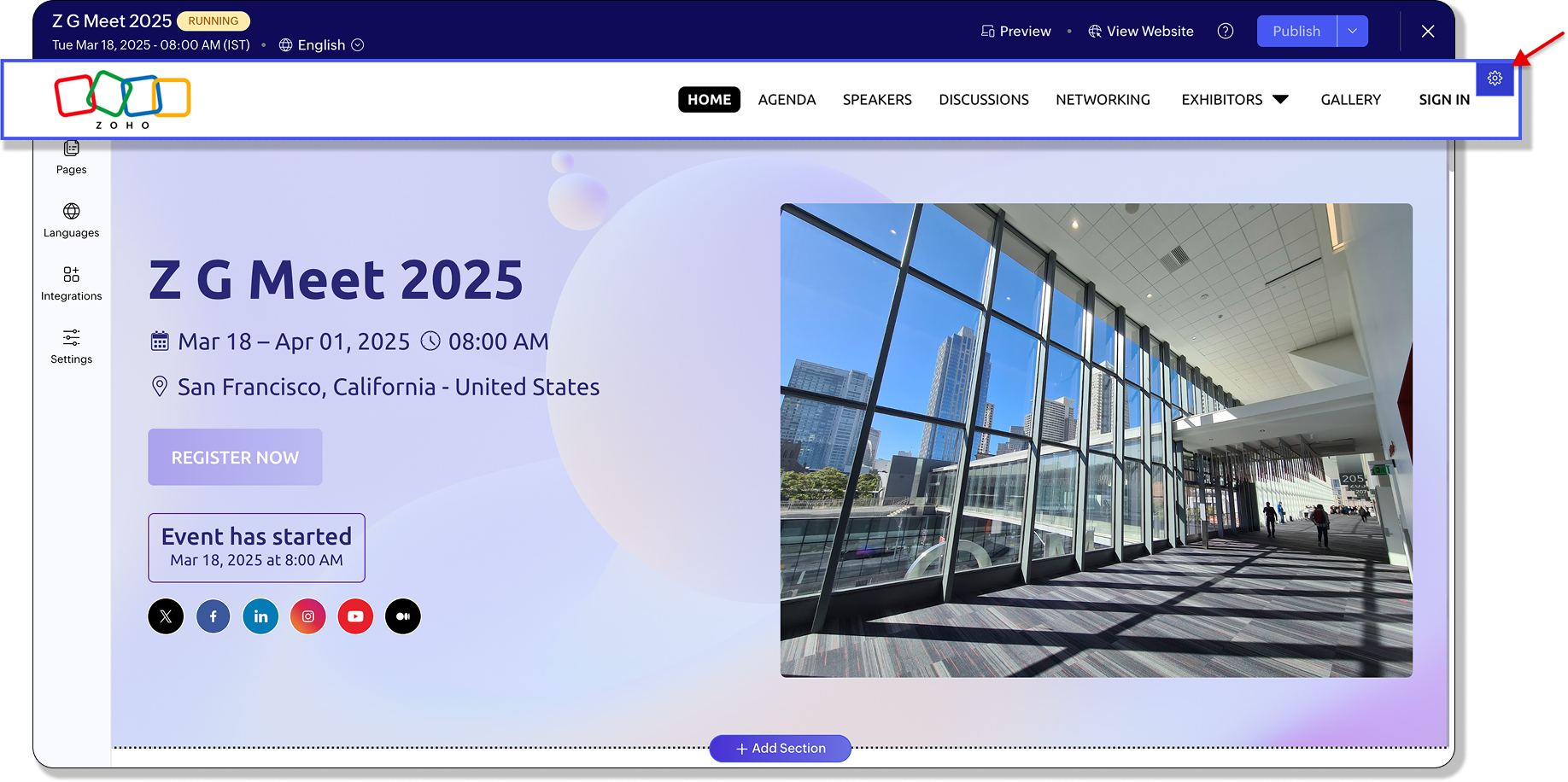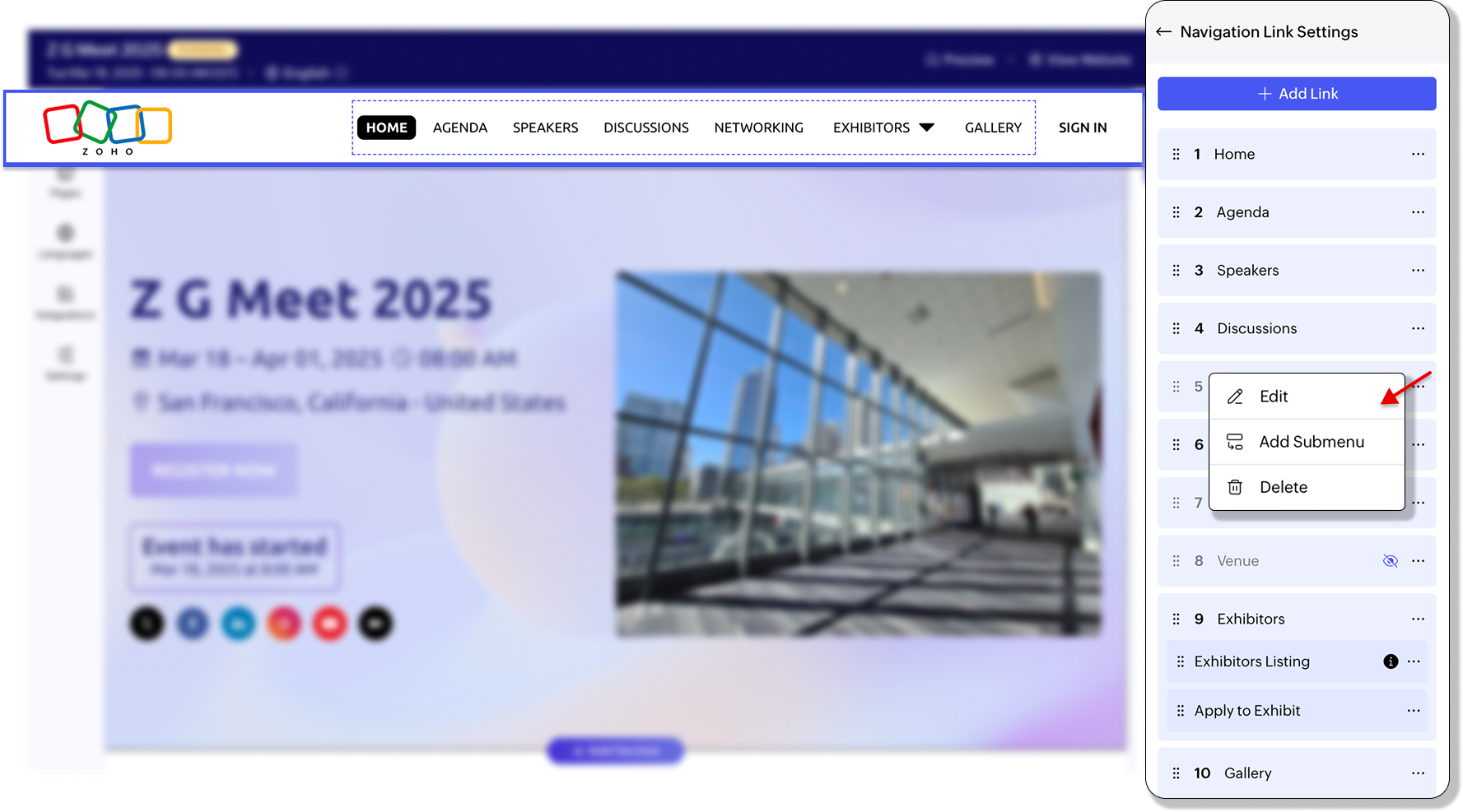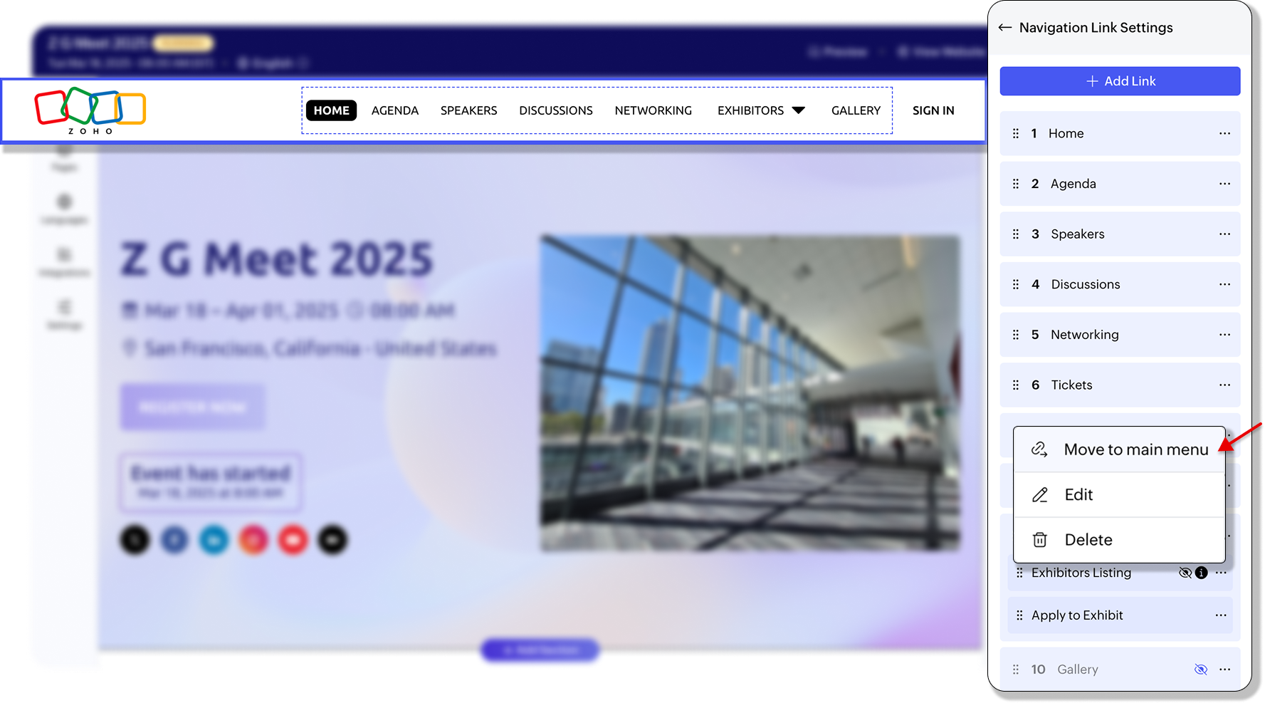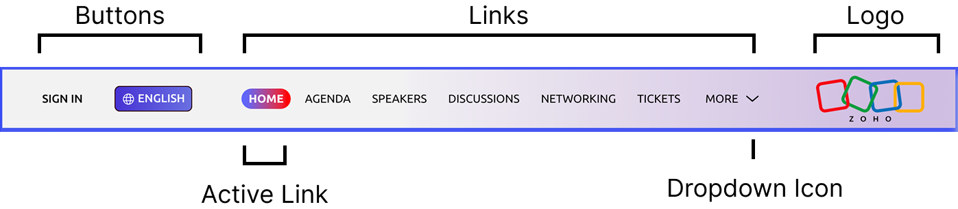 A well-structured website navigation is key to delivering a smooth and intuitive user experience. With Zoho Backstage, you can easily create, organize, and customize your website’s navigation menus and buttons, helping visitors quickly access the information they need.