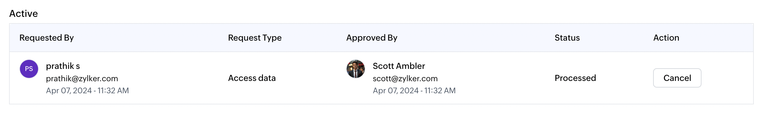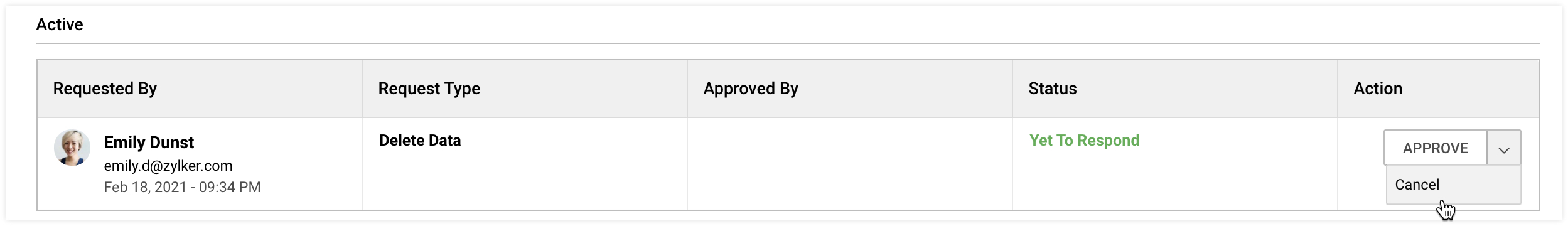 3. Click the dropdown associated with a data request in the Active section and click the Cancel option. The Deny request to access data or Deny request to delete data panel will display depending on the request you want to deny.