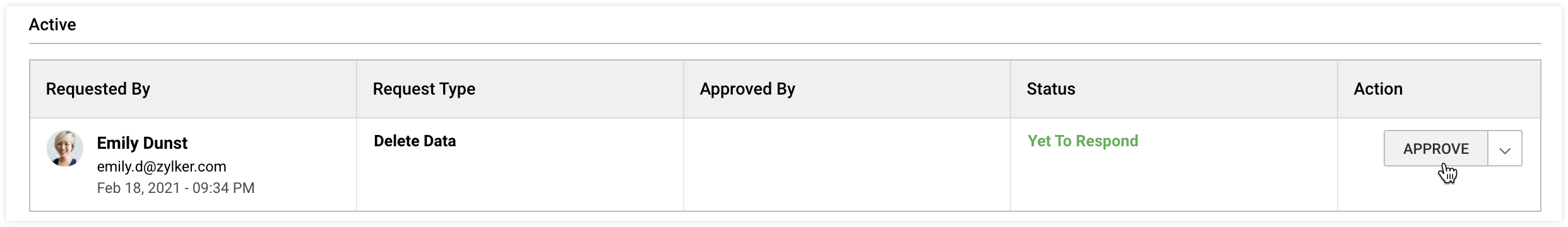 3. Click the Approve button that is associated with a data request in the Action section. The Approve Request dialogue box will appear.
