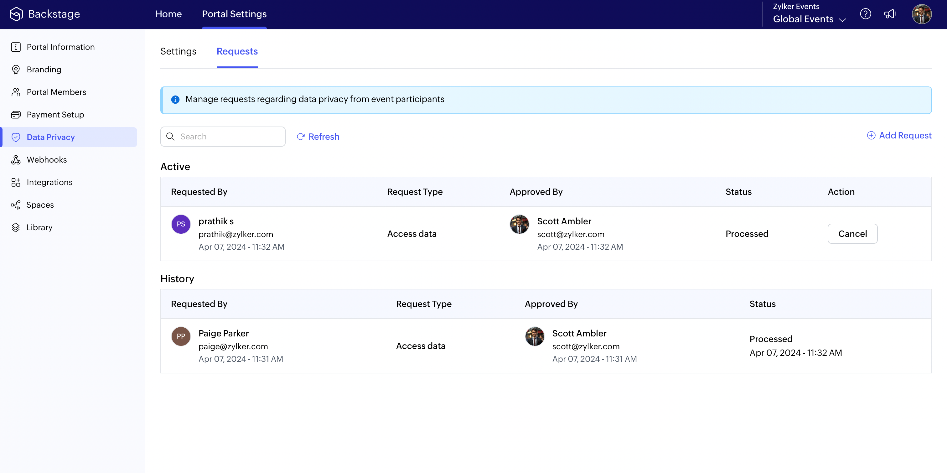 A data access request can also be raised from the portal settings in Zoho Backstage. You can do this when you want to initiate the process on behalf of an event participant or a website user. Once the request is raised and approved, a downloadable copy of the person's data will be sent to their registered email address.