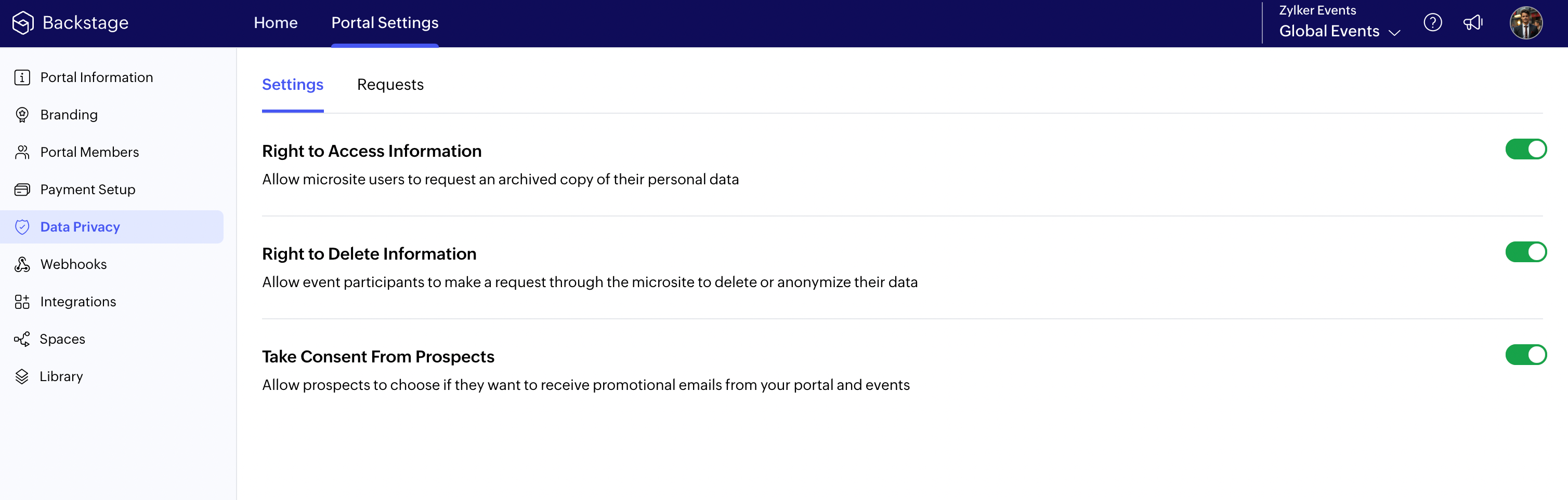 Any event participant or prospect who has an account in the event website can raise a request to access or delete data from the event website.  When a data access request is approved, a downloadable copy of the requester's data will be sent to their registered email address. Once a data deletion request is raised, you must manually review and approve it. After approval, the user’s data will first be anonymized in all events they were part of in the portal. Once this is done, their data will be permanently deleted from Backstage. A user can also revoke any data delete request they have placed anytime before the user's data is completely removed from Backstage.