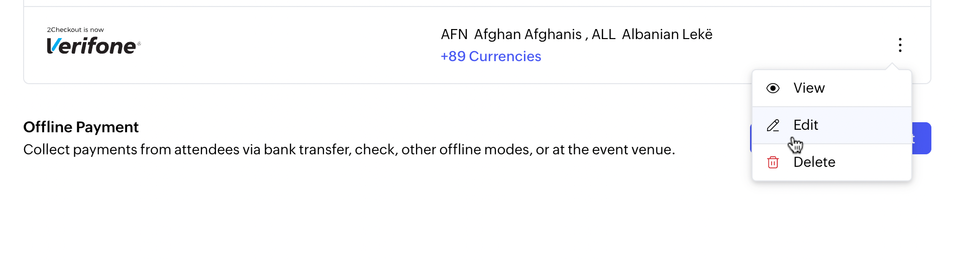2. Select the Edit option from the dropdown to the right the payment gateway.