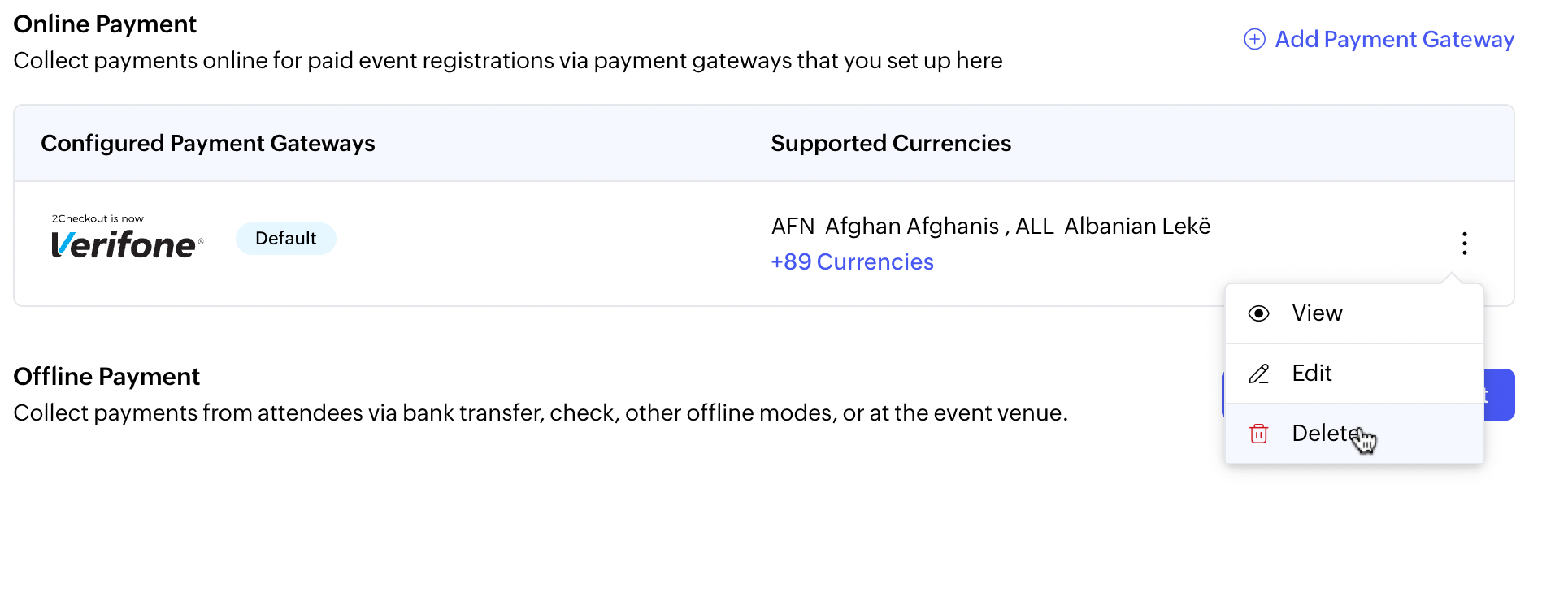 2. Click on the menu icon beside your configured payment gateways and details and click Delete.