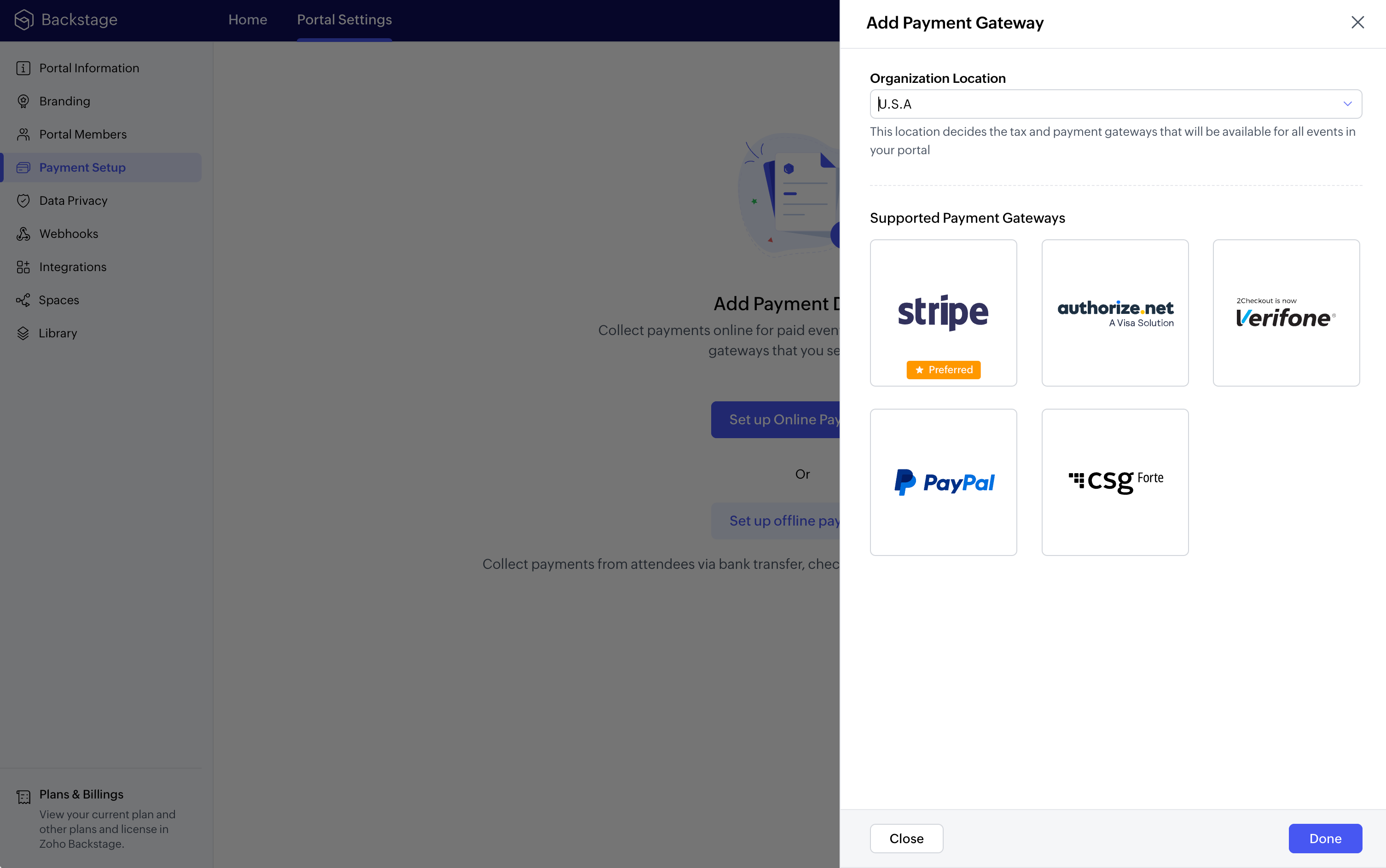 Authorize.net is a payment gateway that enables businesses to manage online payments through credit cards and echecks. Integrate it with you Backstage portal to manage transactions from ticket sales that happen through your event's microsite. Zoho ...