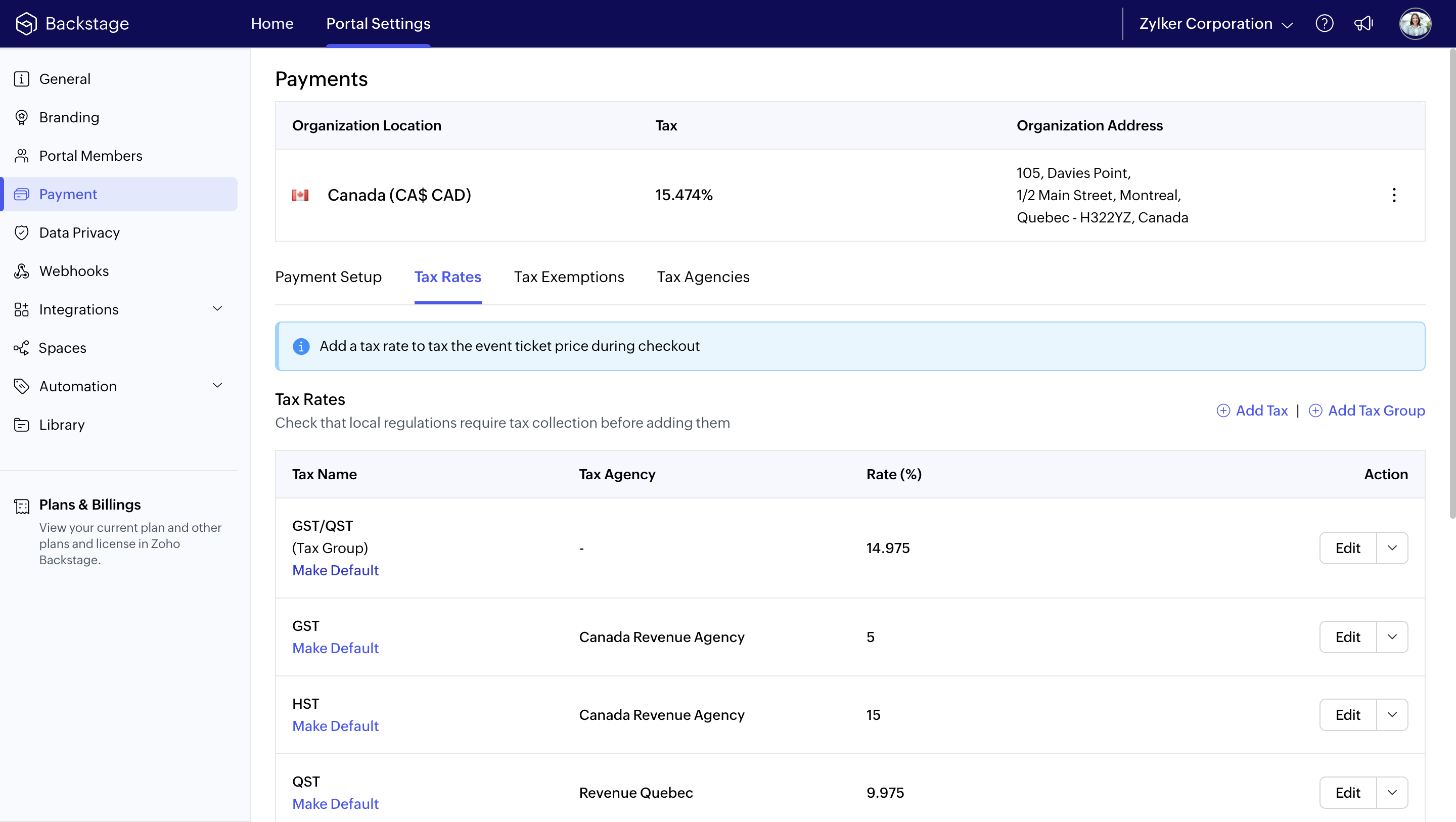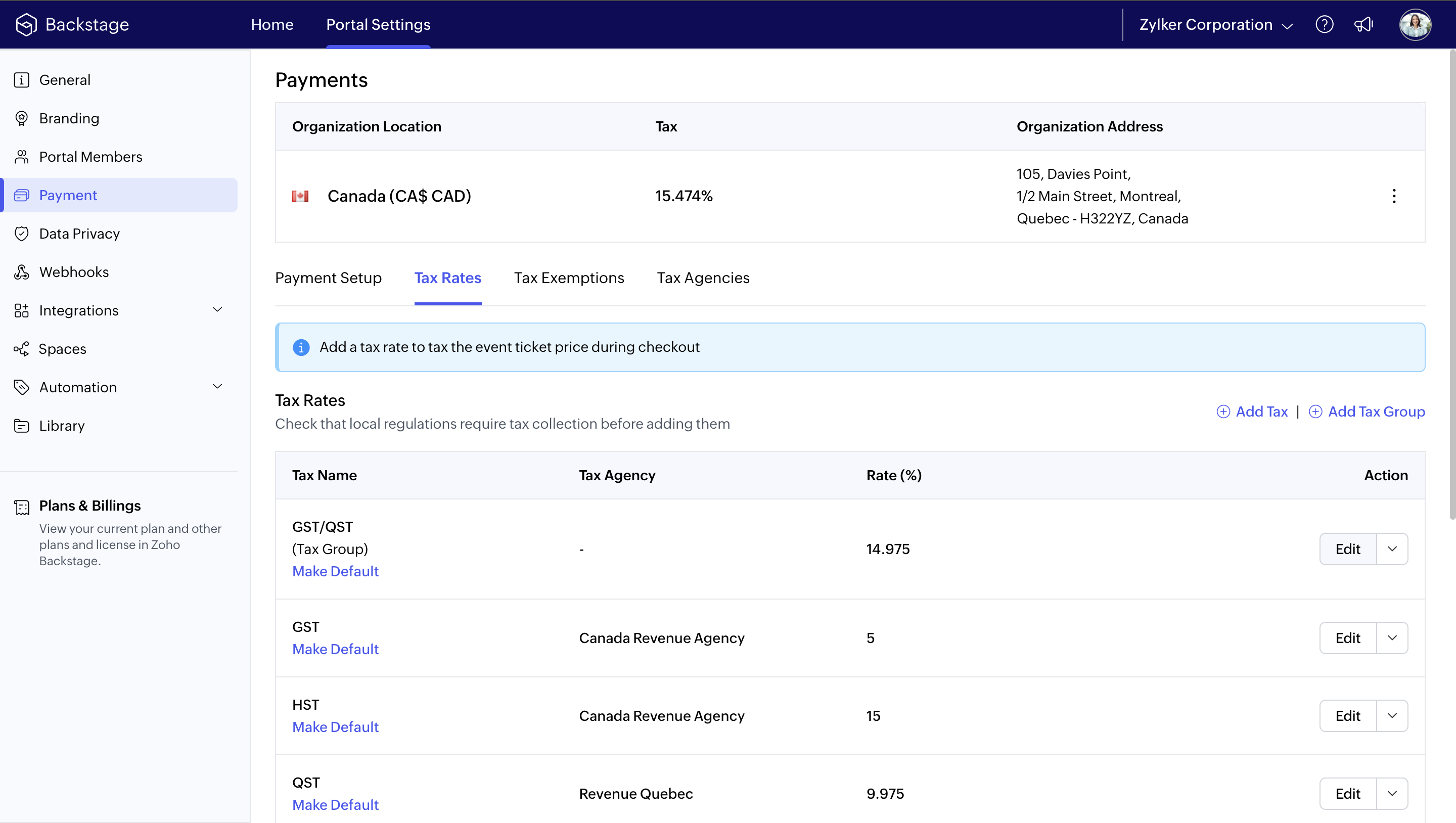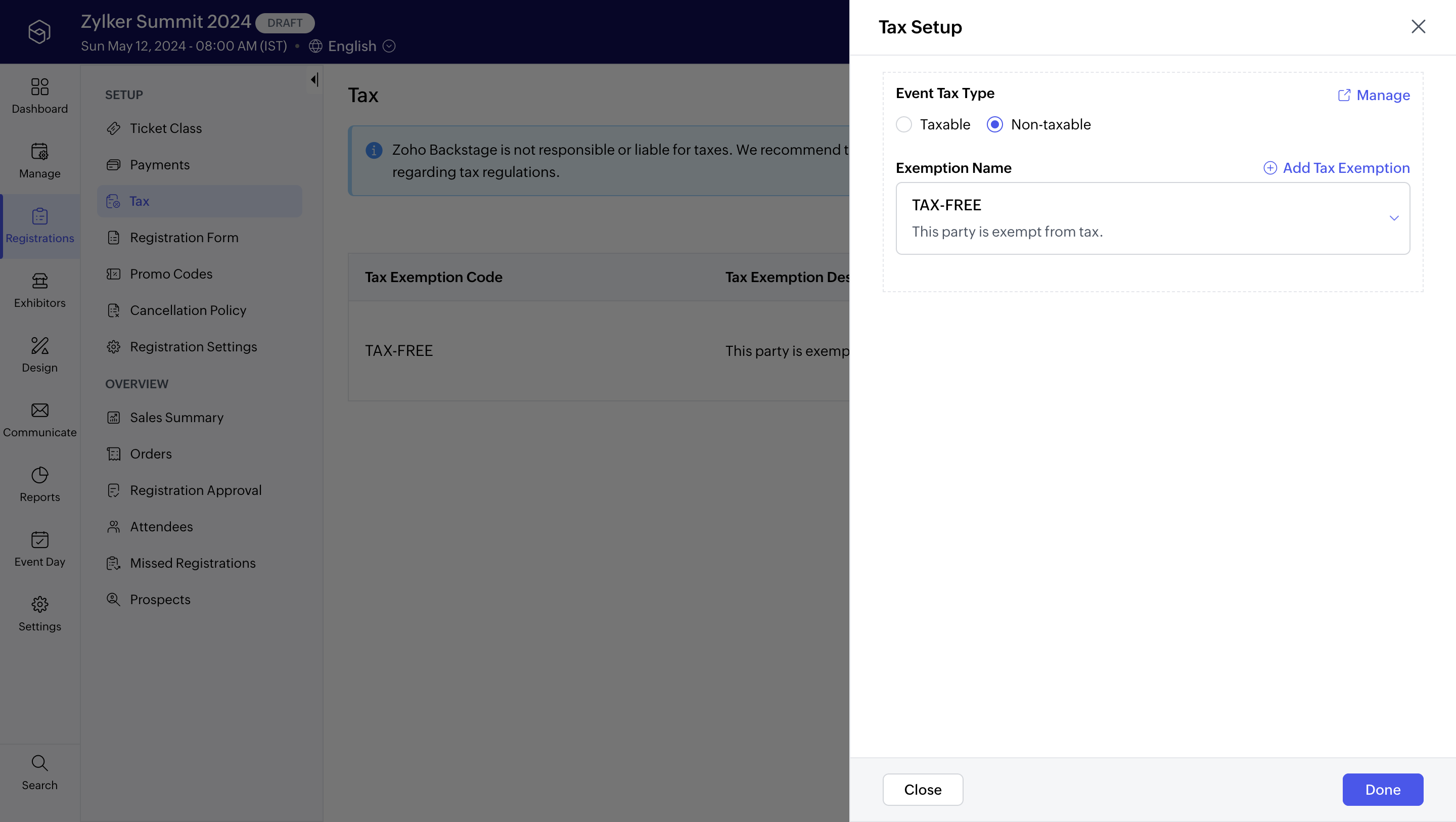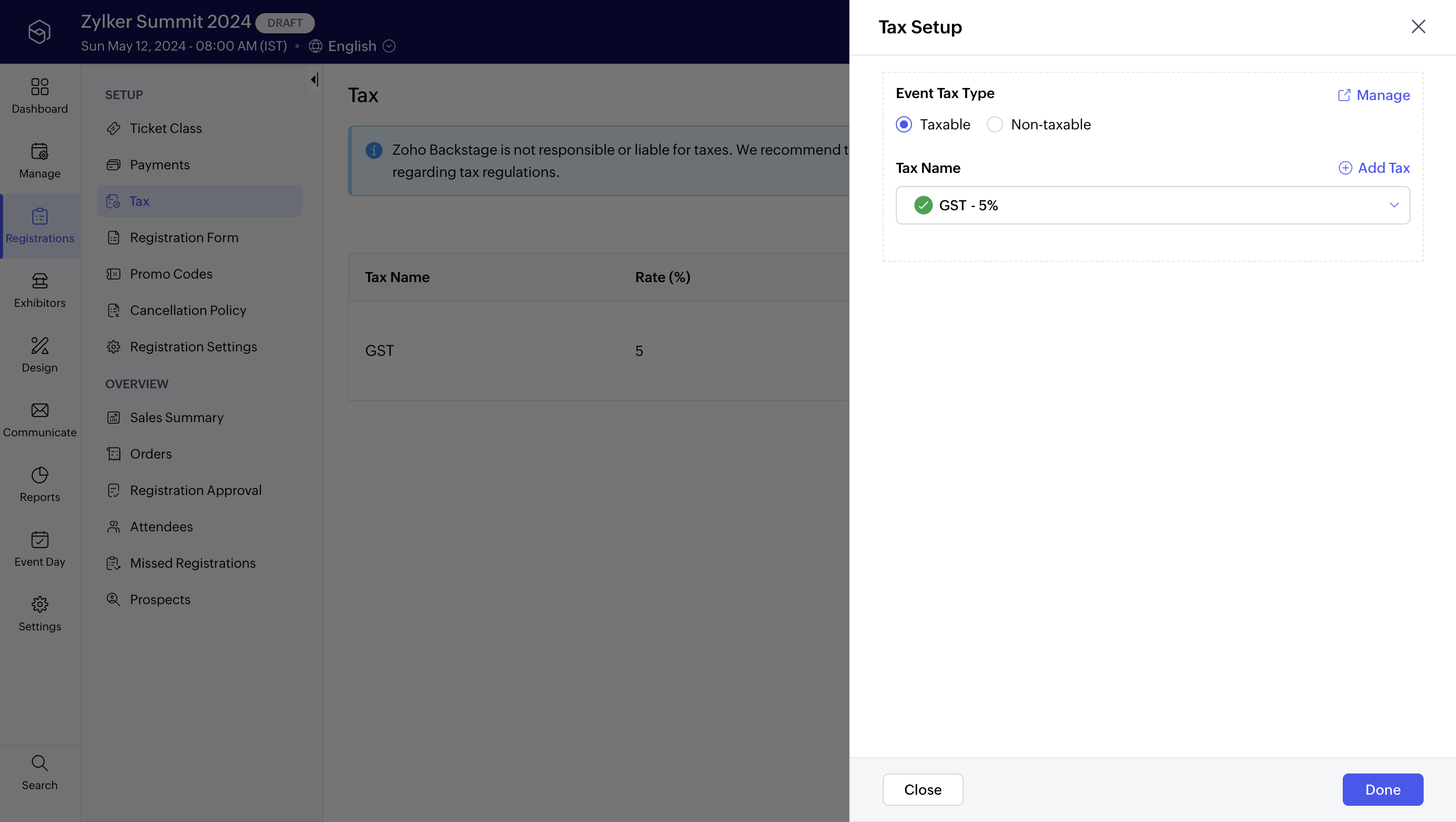 While you can set up and collect taxes in Zoho Backstage, you’re responsible for knowing the tax obligations in places where you’re hosting an event. We encourage you to consult with a local authority or tax professional about tax regulations, as Zoho Backstage can't provide advice on tax.