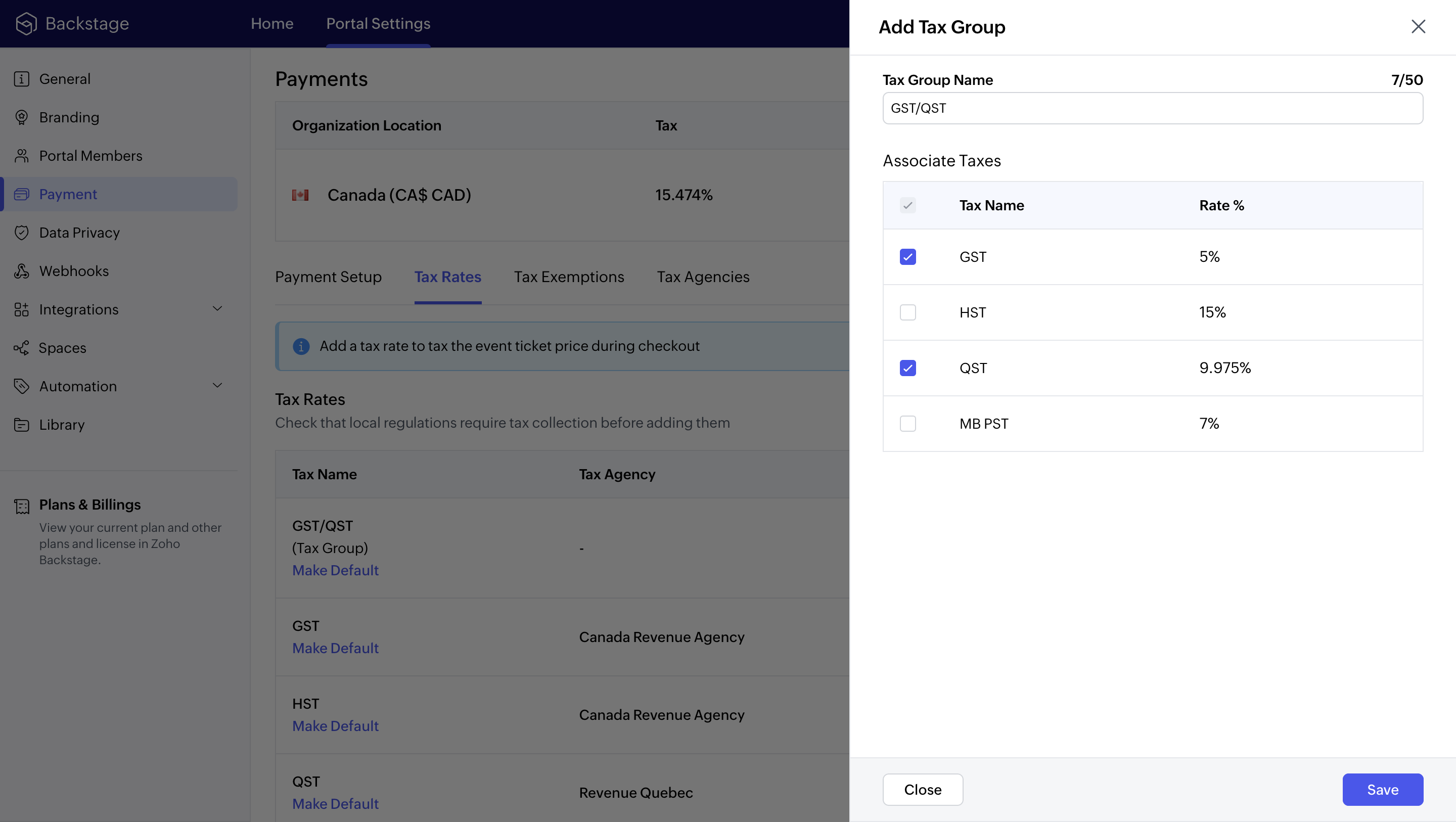 Charge sales tax for your ticket sales by adding your organization's details and setting up tax rates depending on the guidelines of the province you are connected to.