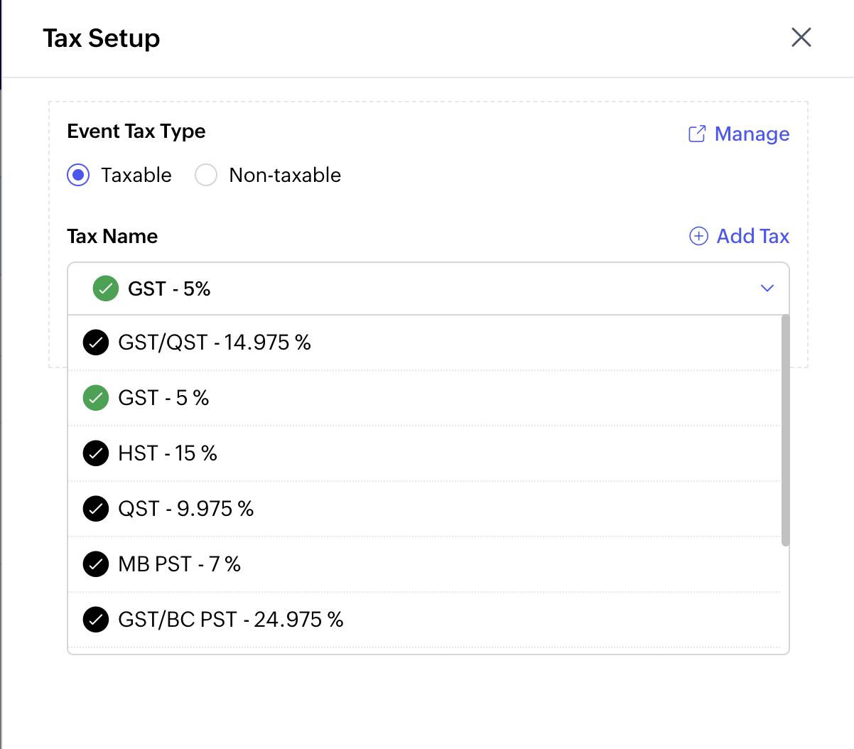 - Select the Taxable radio button to collect tax from your attendees.