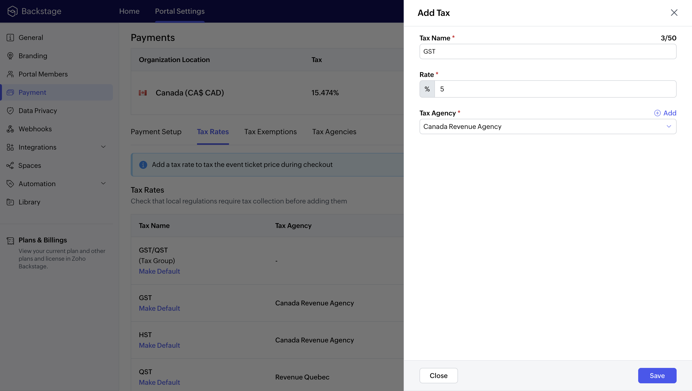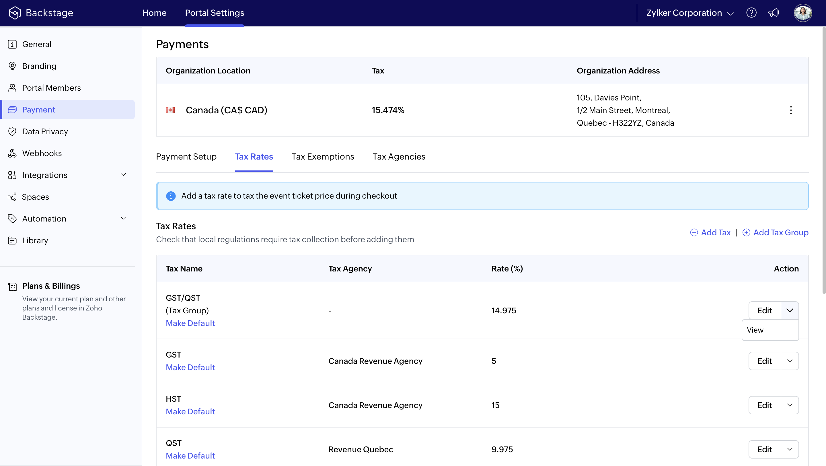 Modify the tax rate for an event even after setting a default tax rate for your portal.